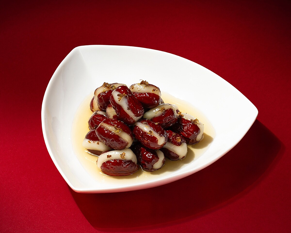 這道甜品名為「心太軟」,不僅形容糯米與紅棗經蒸煮後的軟糯口感。餐廳嚴選去籽紅棗,塞入飽滿糯米,蒸煮至紅棗軟透、糯米綿密,再淋上以桂花釀煮成的香甜糖水,桂花清香縈繞,為整道甜品增添優雅芳韻。紅棗的自然甘甜與糯米的Q彈細緻完美融合,層次豐富,入口即化,尾韻悠長。