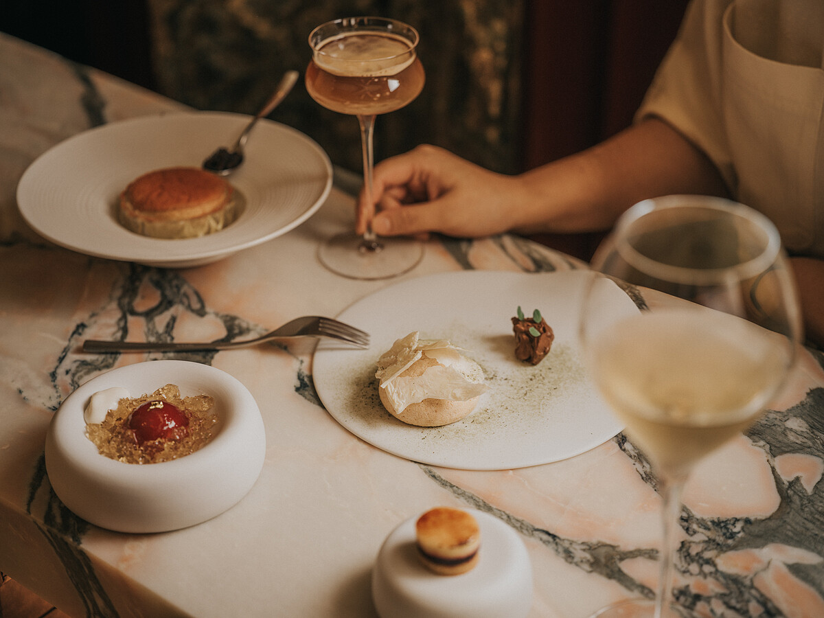 全餐搭配飲品可選咖啡、茶或酒,各自有三款風味設計。咖啡是與Ninety Plus合作,找來2023年世界虹吸冠軍簡嘉程(Stanley)操刀;三款風味從花香、果酸到焙火層次,層層堆疊,咖啡因卻僅等同一杯美式,輕鬆無負擔。茶飲則由琥泊茶苑設計,像是帶花香氣泡的「翠玉烏龍」、發酵後混合接骨木花的「金萱烏龍」、還有帶地瓜甜香的「紅玉紅茶」,依序呼應料理節奏,像極了茶香版配樂。酒類也極具儀式感,個性香檳揭開序章、復刻古老酒款續演,微甜尾聲作結,無論你選哪一條線,都像進入一場味覺戲劇,有情節、有轉折、有記憶。