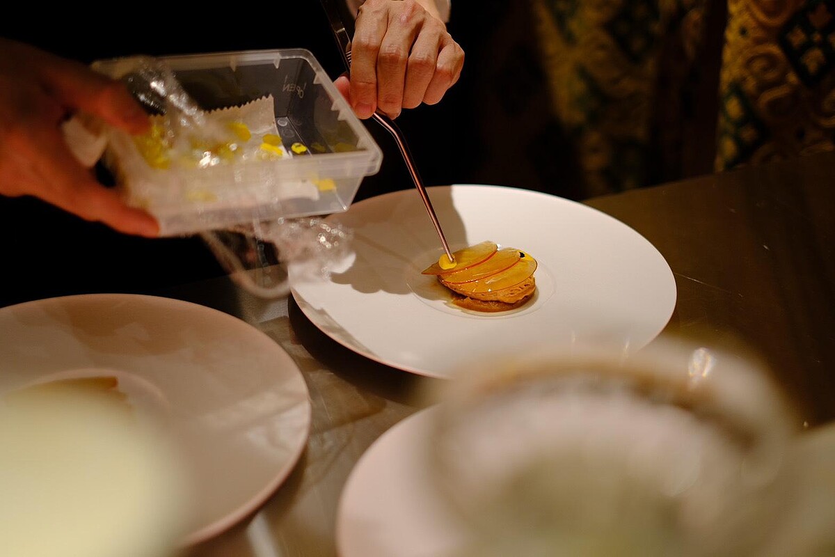 你以為「漂浮蛋白」是那道經典法式甜點?錯錯錯,在Chef Season手上,它搖身一變變成一盤「香水系」蔬菜料理,讓你腦袋直接重新開機。這道菜有趣的地方是雖然名字叫「漂浮蛋白」,但端上來的那一抹雪白,吃起來完全是另一種驚喜。靈感來自古早的法式甜點,但使用蔬菜、香料和料理技法去重新組裝風味,還把香水的氣息融進去,整道菜有種輕盈、空氣感的層次。可以說是既精緻又有點調皮。