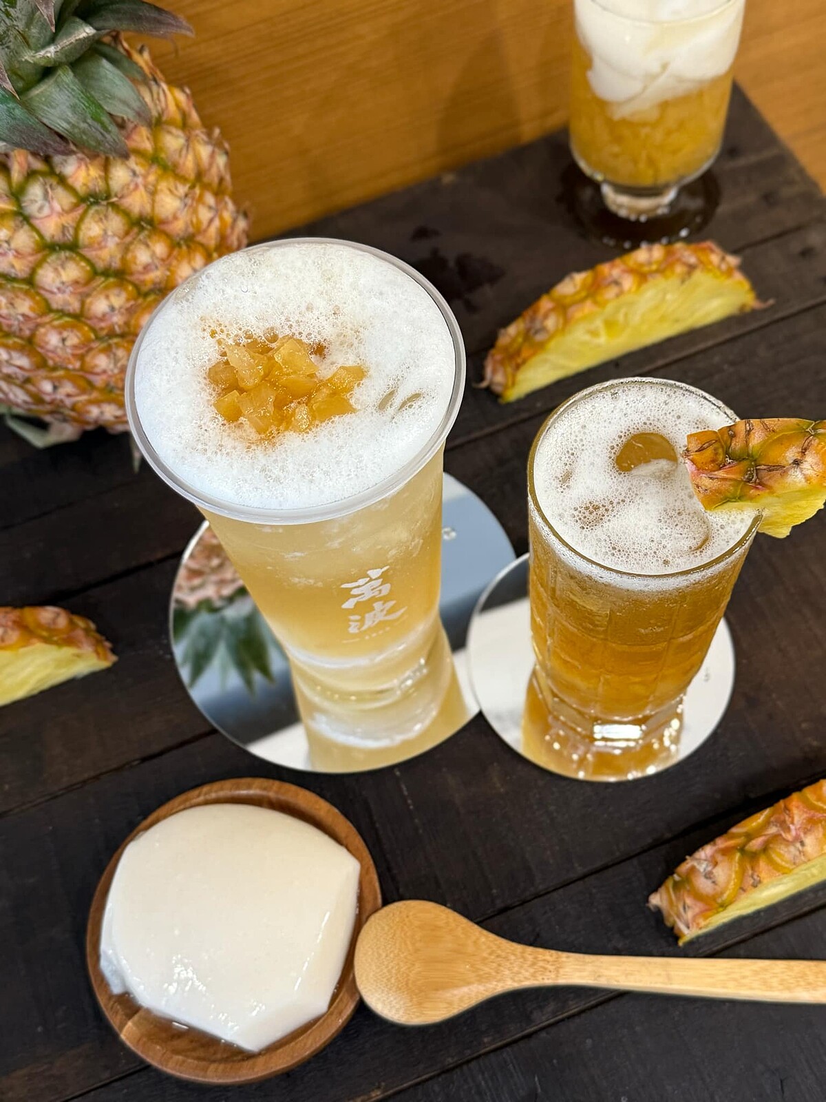 這次的鳳梨系列飲品包括「金鑽杏仁露」與「金鑽鳳梨綠」,嚴選「金鑽鳳梨」(台農17號)搭配土鳳梨熬製鳳梨醬,保留金鑽鳳梨的香甜果味,也揉合土鳳梨特有的微酸風味與纖維口感。