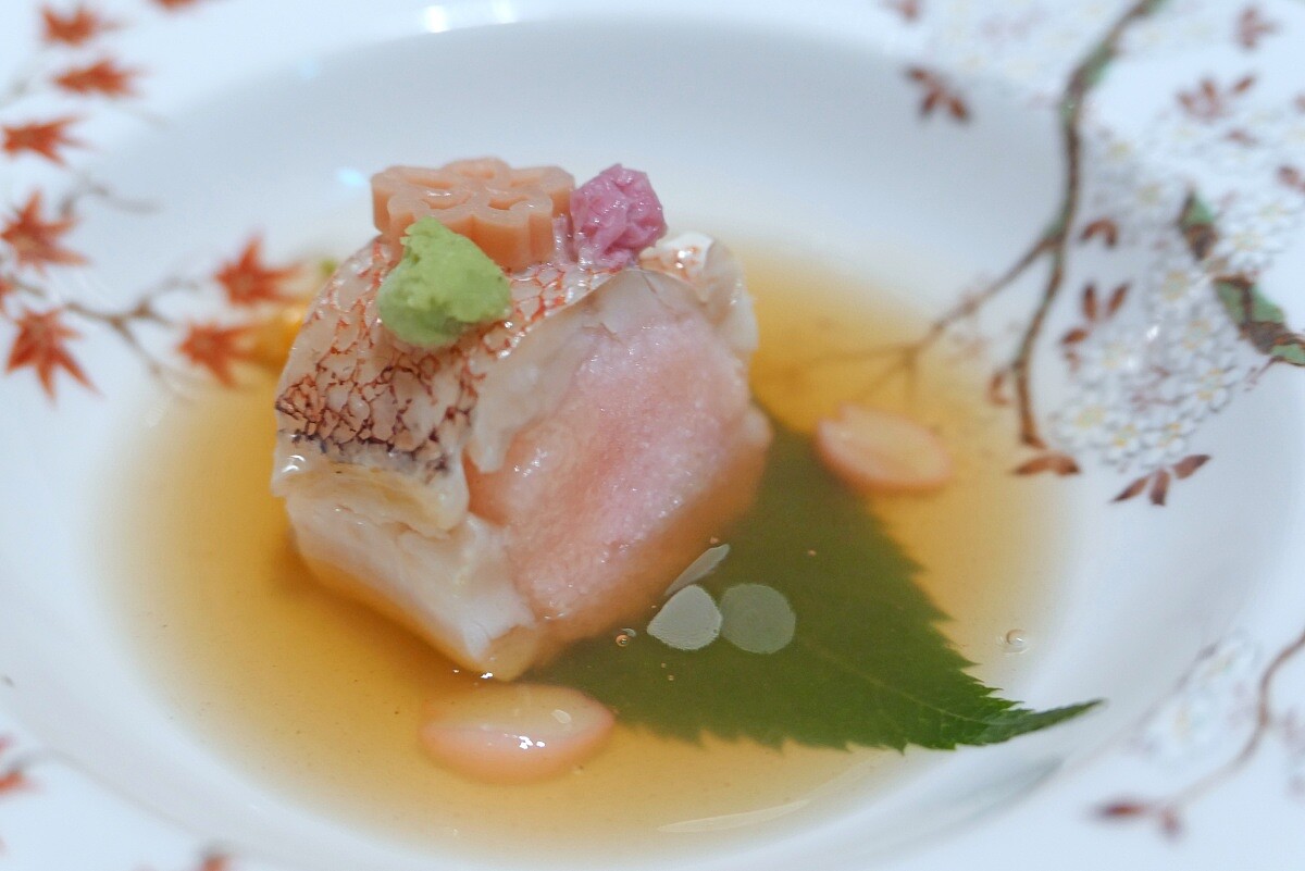 選用甘鯛兩側細嫩魚肉,撒上薄鹽靜置,輕柔去除多餘水分與腥氣,讓魚肉風味更加純粹。隨後以泡軟的糯米粉細緻包裹,蒸製至魚肉與糯米緊密結合,再切片擺盤。底層鋪上鹽漬櫻花葉,表面輕點醃漬櫻花,不僅添增春日氛圍,也讓整道料理洋溢著和風的雅緻與清新,視覺則充滿春天的意象。