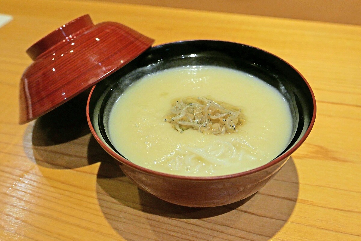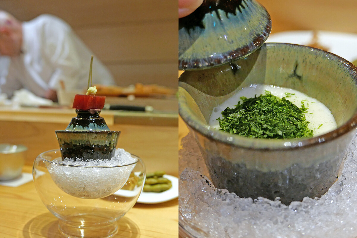 此外,菜色除了呈現出日本料理的精緻與創新,也巧妙地融入了中華料理元素,從醬料的選用到食材的搭配,無論是在口感層次的變化,還能看見兩種風格相互融合。尤其是醬料的運用,他將中華料理中的鮮香、鹹甜與層疊放進菜色,像是在「醬油漬鮪魚赤身」與「山藥泥」的搭配中,就取用自家製豆瓣醬溫煮鮪魚赤身,更是直接借鑒了中華料理中對豆瓣醬的運用,豐富的鹹香與深度,與鮪魚肉的鮮甜完美契合。