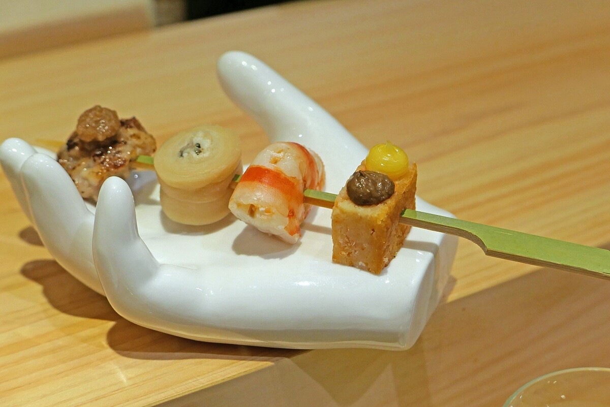 以模擬糰子串的方式呈現,將各種美味食材巧妙串起展現豐富的口感。首先,宜蘭的軟絲糰子以Q彈軟絲製成丸狀,微煎至外層香脆,再刷上手工照燒醬,鹹甜的味道令人開胃。接著,長崎縣的白燒星鰻被包裹於乾瓢卷中,利用其骨頭加入清酒與醬油慢煮,將濃郁的味道與清香完美融合。隨後是東港的小明蝦,輕煮於柴魚與昆布高湯中,保留了鮮味,甜美中帶著一絲香氣。最後,融合東港櫻花蝦與西式帕瑪森起司,外酥內綿,鹹香交融,為這道料理增添了一抹獨特的風味。每一串食材都各具特色,卻又在口中形成完美的和諧交響。