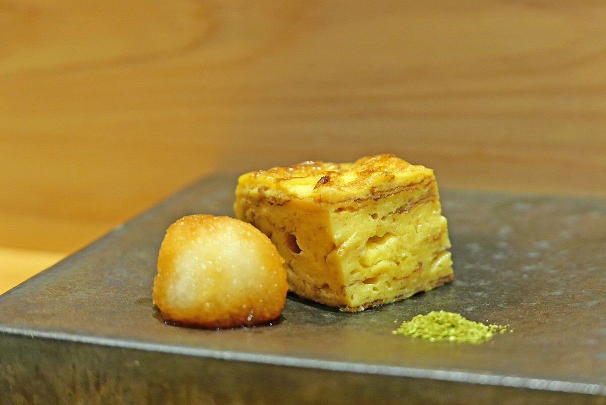 將柴魚與昆布熬製的日式高湯與雞蛋細火現煎融合,層層堆疊出綿密柔嫩的口感。品嚐時可輕輕撒上微嗆的山椒粉,帶來清香與辛辣的層次感,增添了尾韻的深度。最後搭配醬油蘿蔔泥,讓整體的口感更加清爽平衡。