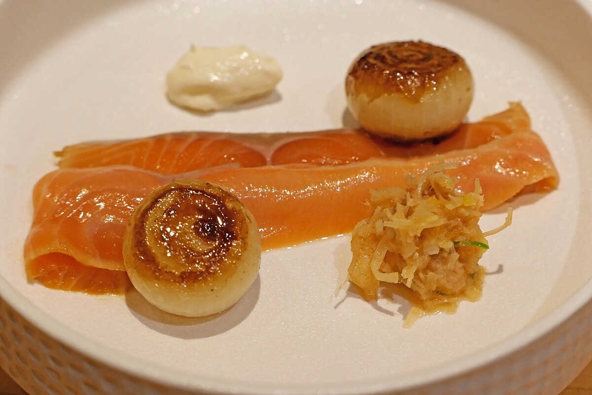 為青森縣春季限定的櫻鱒,融合了中華風味的巧妙搭配。櫻鱒佐以自家製的優格鹽麴醬,鹽麴的發酵風味與優格的酸度,讓魚肉的鮮美得以展現,融入干貝風味的XO醬,這款醬料源自中華料理經典風味,鮮香微辣的特色與櫻鱒的鮮甜交織,是這品料理最大的亮點。