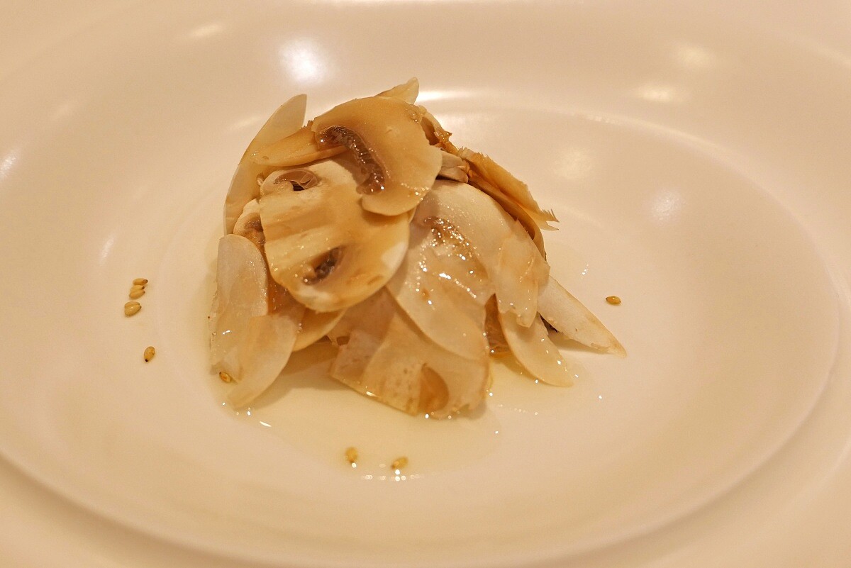 使用鯛魚生魚片搭配水煮鯛魚皮拌胡麻醬,呈現出清爽與濃郁的完美平衡。新鮮的鯛魚片質地細緻,與香濃的胡麻醬結合,帶來豐富的風味變化,加上水煮的鯛魚皮充滿彈性的口感,正好呼應了蘑菇的清香。