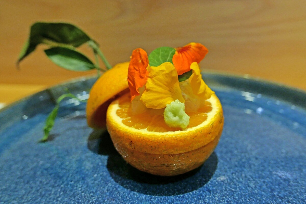 上桌時是完整的茂谷柑外型,其實層層都是驚喜。最上層使用台灣茂谷柑製成的果凍,與鹽漬櫻花點綴其中,可搭配水針魚一同食用,入口時清爽香甜的柑橘與水針魚的鮮香相得益彰,並帶有微妙的鹹味非常迷人。中層的水針魚與芥末一同享用,清新的口感搭配芥末的辛香,增添了豐富的層次感。
