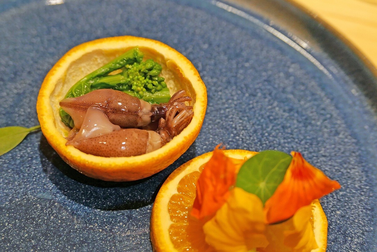 還有這次令人最印象深刻的「茂谷柑」,形式華麗且極具層次,不僅風味層層疊疊,每一口都帶來驚喜,連用餐過程中也充滿了與賓客的互動與期待。Hiroki 主廚也特別分享了他的創作過程,他提到,柑橘類與水針魚的搭配本來就具備天然的和諧性,相比傳統的橘子汁,他認為選擇以果凍呈現,能讓口感的層次更加分明且富有層次感。在挑選柑橘品種時,由於日本較難取得帶葉的柑橘,他特別選擇了當地適合的橘子來替代傳統的柚子。無論是在台灣、香港或深圳分店,這道料理都精心選用了當地新鮮的橘子,並以橘子的外皮作為容器,不僅突顯食材的鮮美,也展現了當地獨特的風味與特色。
