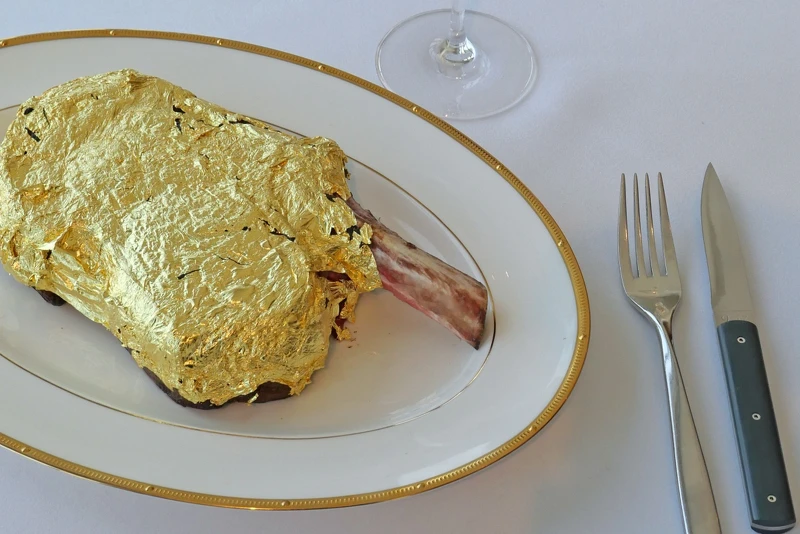 Chef Josh 以炭火慢烤與靜置回溫,為不同肉質調整料理的呼吸節奏。每一塊牛排需經過高溫封鎖肉汁,再以低溫緩慢爐烤,整整40分鐘的等待,換來切下時骨邊微紅、肉香溢出的完美熟度。除了技術,「LOPFAIT Grill」也大膽嘗試推出最具話題的「24K黃金牛排」,主廚選用澳洲 Blackmore 純血和牛,裹上20張食用金箔,厚達1.1公斤的肋眼在火烤後呈現如金斧般的光澤,除了視覺效果,也向牛肉本身的稀有性致敬。
