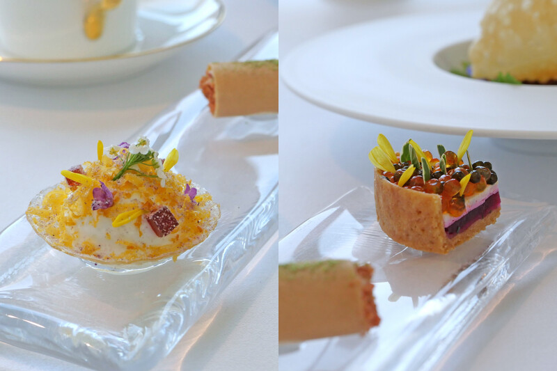 纖薄的小塔仍細工做出醃漬大根、煙燻甜菜根、香草酸奶與鱒魚卵等四個分明層次,美得讓人不忍破壞,風味一如想像清酸淡雅。