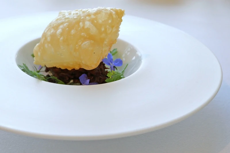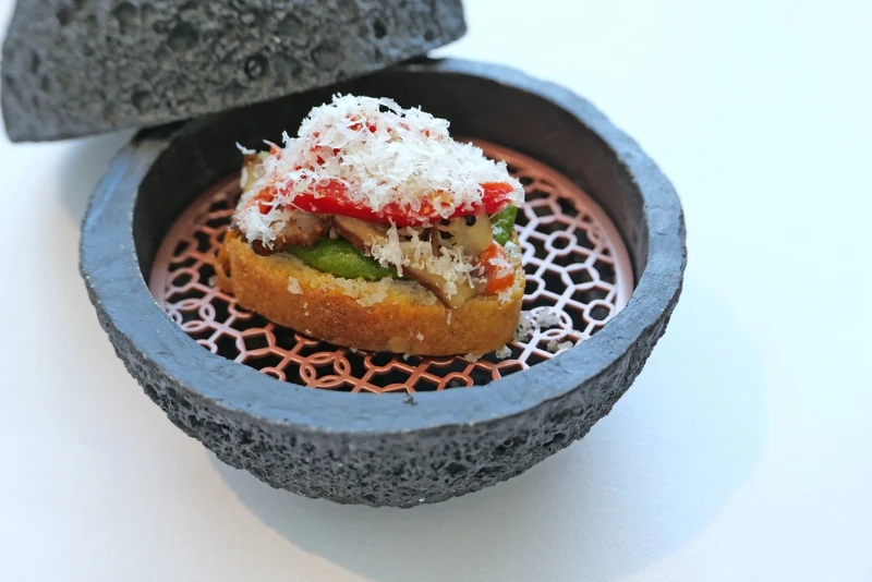 小巧的香緹捲填滿鵝肝與鮮奶油做成的慕斯 ,內藏宜蘭鴨賞尤為風味亮點 ,陳年菜脯與蒜苗做成的粉末具畫龍點睛之妙。