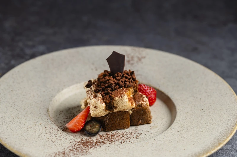 以甜點車、桌邊服務的形式登場,提拉米蘇從模型中現場挖取、現場裝飾,依顧客喜好加入莓果、堅果、可可粉等配料。