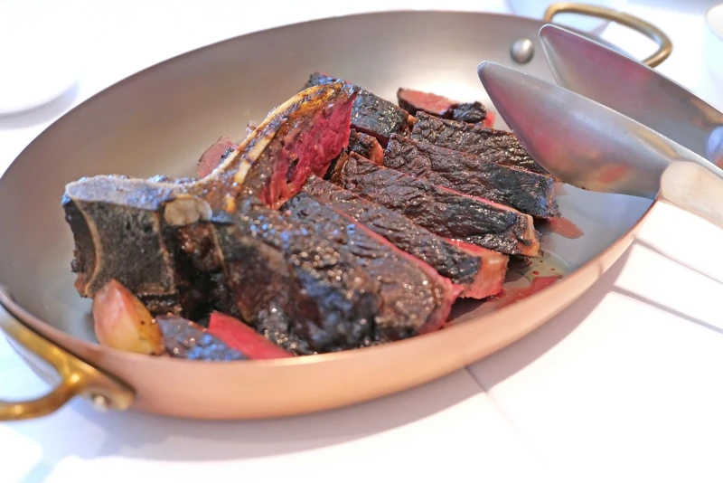 重逾1公斤的丁骨牛排集菲力柔嫩與紐約克的多汁嚼感於一身,除沾義大利海鹽嚐試原味,主廚特製肉汁與黑蒜醬也是極佳佐味。(午間套餐售價NT4,080元/位,五道式。晚間套餐售價NT4,580元/位,八道式)