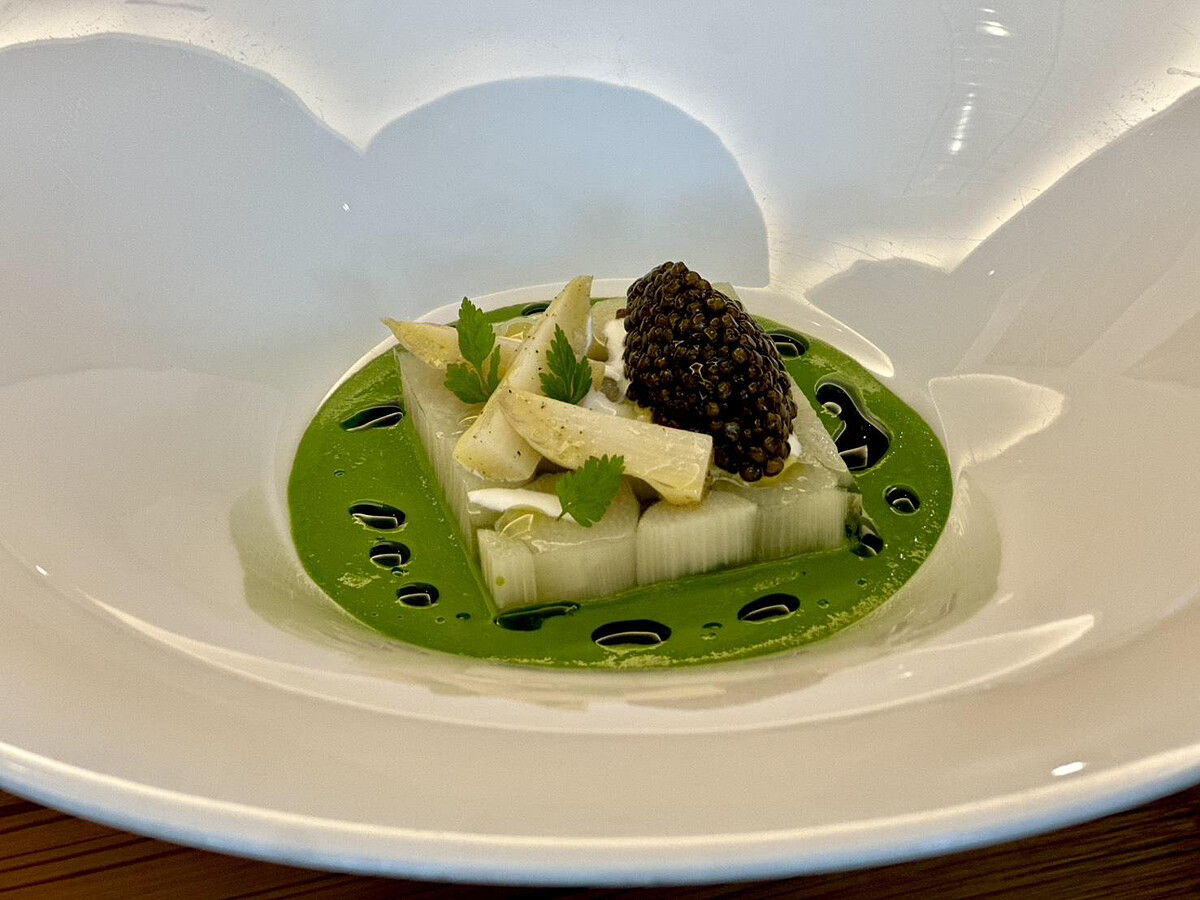 白蘆筍被製成法式凍派,搭配海瓜子菠菜醬,酸奶與薄荷油點綴盤面,頂部再放上一抹魚子醬,一口下去從海的鮮到草的綠,再到發酵鹹香的疊加,天然的食材彼此對話,沒有多餘調味卻風味飽滿。