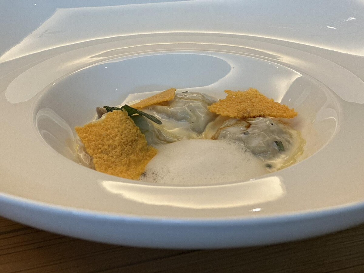 鴨腿肉先經長時間油封,封進手工餃子皮裡,再用帕馬森起司與鼠尾草調成的醬汁包裹,醋漬鴻喜菇一旁輕輕酸著,解膩也平衡,帕馬森脆片最後添上口感轉折,像是走進一座古典的義式花園。