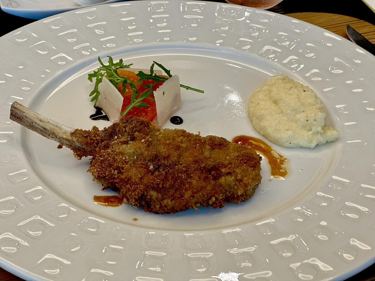 義式經典做法,小牛肋排外裹帕馬森與麵包粉,煎到金黃酥脆,一旁搭配慢火熬煮的Polenta,綿滑濃郁,整道菜是歐洲鄉村的溫暖回憶。