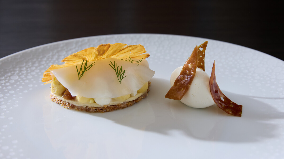 當季金鑽鳳梨遇上台灣清酒,酸甜與微醺結合。酒粕做成的果凍包裹著百香果凝乳與白巧克力香緹,再配上帶有可可香氣的鳳梨脆片,清酒雪酪收尾,整道甜品就像一杯春日微風調酒,酸甜中藏著醉意。