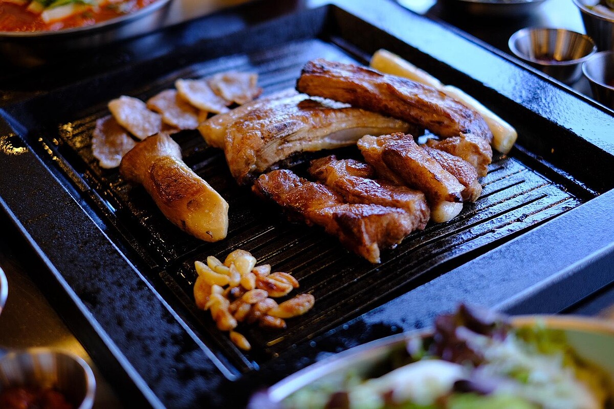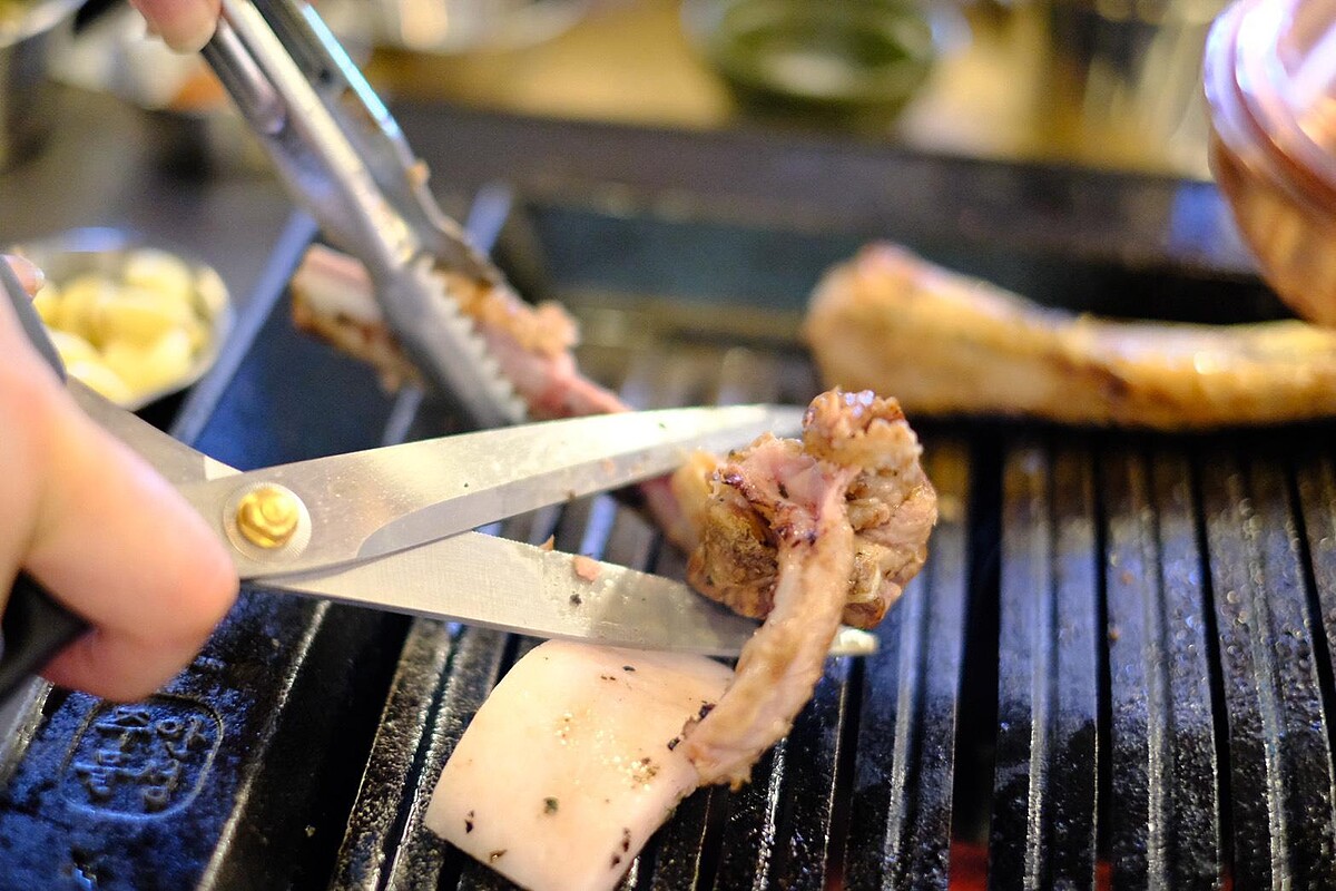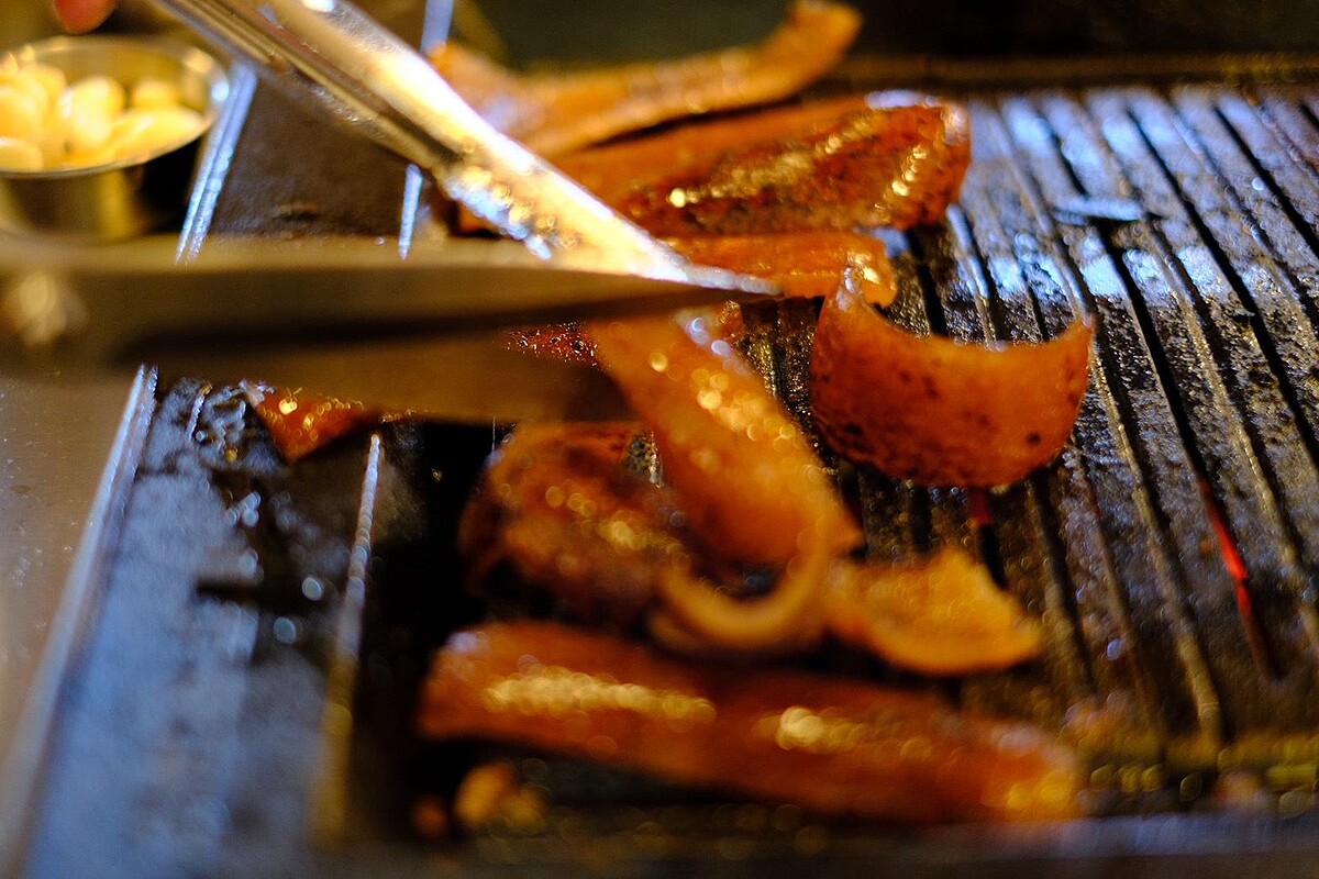 這裡的每一道料理都不是配角,前菜只有一道「秘漬醃蘿蔔」,加入蒜苔與糯米椒開胃又解膩。泡菜鍋使用韓國空運泡菜與五花肉燉煮2小時,再加入韓國農心拉麵變成一鍋兩吃。烤肉則是由職人代烤,霜降肉搭配青蔥醬微酸平衡油脂,梅花肉建議佐馬爾頓海鹽回甘鮮甜,五花肉則以甜蘿勒包裹入口香氣爆棚。最後甜點是台灣少見的「烤豬皮」,外脆內Q,搭配韓式蒜醬與黃豆粉,鹹甜交融,讓人驚艷。