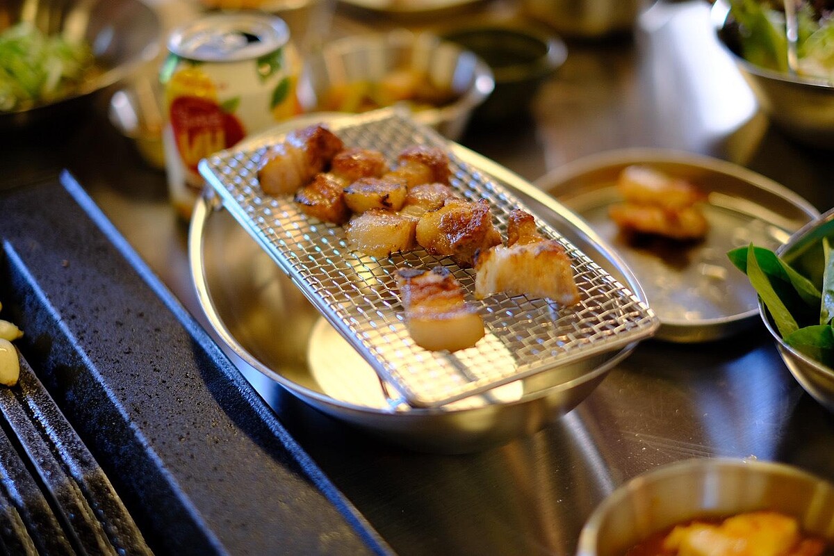 台北店使用台灣頂級豬肉品牌「究好豬」,從豬隻飼養開始就精準控管,選用與韓國本店相同的LYD優質豬種。肉品經低溫熟成、專人修切,每塊肉都像藝術品。招牌松坂肉、霜降肉、梅花肉、帶皮五花到韓國最珍貴的「正腹皮」一應俱全,由專人桌邊代烤,火侯精準、熟度完美,讓你每一口都吃到層層肉香,因為豬肉品質非常好,烤出來的熟度約在8~9分,避免過焦影響口感。