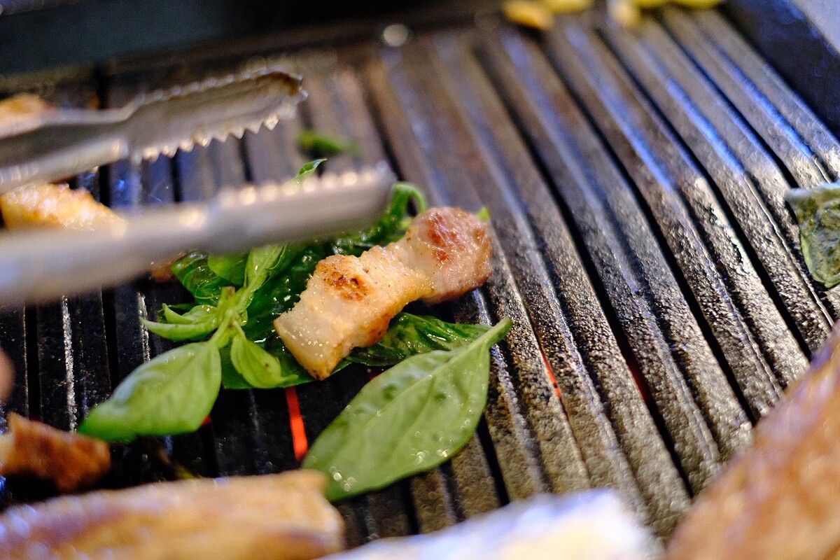 為還原最道地韓燒,「金豬食堂」連沾醬都從韓國直送,搭配英國馬爾頓天然海鹽與韓國專屬餐具,吃燒肉像進行一場飲食文化儀式。特別的是台灣店還與本地農場合作「甜蘿勒葉」,烤至微焦後包裹五花肉食用,清香爽口、韻味十足,創造出台灣限定的韓式吃法。
