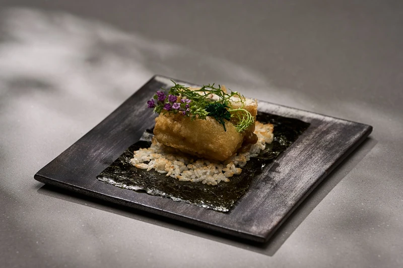 不僅如此,米飯底層還藏有以雪莉醋與波特酒調味的烤茄子,提供滑順質地作為脆口米鍋巴與天婦羅之間的味覺橋樑。這一切包裹在高級日本料理專用、來自豐洲林屋的海苔中,成就一道結合地方米種、海味、香料與多重口感的創意手巻き,既是味覺遊戲,也是一種文化的自我詮釋。