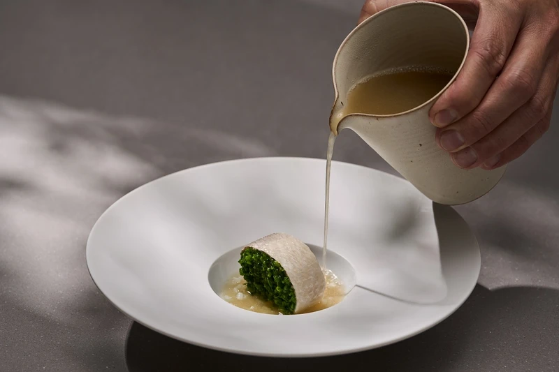 為了展現台灣養殖虱目魚獨有的鮮美與細膩,主廚選用來自高雄三多市場、以取肉技術見長的供應商,而虱目魚獨特的氣味,則用法式低溫烹調手法,除了能保留魚肉彈牙口感,還能避免掉用高溫快煮常見的腥味。不同於傳統虱目魚粥或米粉湯的料理方式,讓這道菜更貼近 fine dining 的精緻詮釋。他以法國人擅長處理蛋白質的技藝,將虱目魚包入融合東星石斑魚漿與伊比利豬的內餡,其中醃漬酸菜則展現 HAILI 對亞洲風味的駕馭能力。搭配蘑菇泥與水粉,最終湯頭入口是鮮鹹飽滿、層次豐富的圓滿收束。