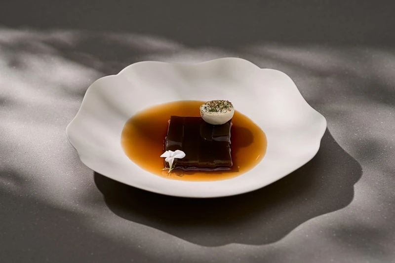 這道料理以活體鱈場蟹為主角,融合法式細膩與粵菜技法,取「生滾粥」的作法,將雪場蟹與高雄在地的147號米一同熬煮成奢華版雜炊。蟹的濃郁精華完整滲入米粒,透過精準的火侯與溫度控制,使粥體綿密卻不失顆粒感。主廚並巧妙加入港式蒸蟹常見的花雕酒,引出蟹肉的醇厚鮮美。可先品嚐原味的濃厚蟹粥,再拌入來自高雄岡山的豆瓣醬,為整體風味增添一抹辣香與在地氣息。搭配一旁的小缽菜,則是以鱈場蟹蟹身入菜,佐以油醋、柚子皮、西芹葉與糙米米香,呈現出日式沙拉般的清爽口感,也延續了「清粥小菜」的靈感與多樣性。是一道結合地方食材、亞洲料理語彙與現代手法層次豐富的菜品。