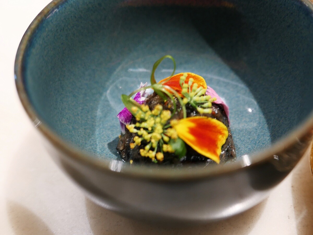 靈感來自華人文化中經典的小菜形式,由主廚團隊將童年回憶與熟悉風味重新演繹,打造七道精緻且層次分明的開胃小品,體現文化底蘊與當代料理手法的融合。從右至左依序展開,一開始是靈感來自鼎泰豐小菜的「烤麩」,以剝開的四把烤骨填入乾淨瑤柱與乾燥海鮮,淋上紅燒醬汁,香氣撲鼻。接著是「梅醬南瓜」,源自主廚童年春假期間家中涼拌南瓜的記憶,將南瓜炸熟後拌入梅醬,搭配蟹心苗與蔬葉,呈現酸甜開胃的風味。「蟹肉捲」以生蟹為餡,外層包裹燒生捲,詮釋對蟹料理的全新想像。