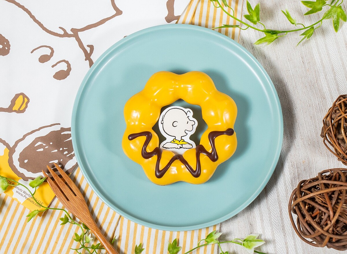 而「查理布朗甜甜圈」則是換上乳酸風味的可可沾醬,再塞滿蘋果卡士達醬,最後用可可線條勾出查理布朗經典那條「焦慮的眉毛」,超級傳神!還有一款「查理布朗衣服」也超可愛,選用當紅波堤沾上檸檬可可醬,畫上招牌Z字條紋,完全把角色特色穿上甜甜圈。
