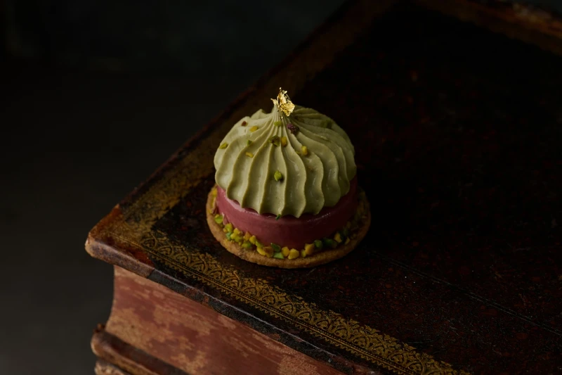 以「西西里島布朗特綠開心果」為主要食材,搭配覆盆莓的天然酸香,整體口感多層次又細膩,在果香與堅果香氣之間,取得剛剛好的平衡。底層則是無蛋配方的「杏仁奶酥」,用紅糖和杏仁粉製作,酥酥的、還帶點焦糖香;接著是濕潤的杏仁蛋糕,讓整體吃起來多一份溫潤的堅果風味。中段加入混合了布朗特開心果醬、碎果仁和鹽之花的脆餅,酥脆又有鹹香,讓口感更有變化。而夾層的覆盆莓奶餡則是用大量果泥加上減糖配方做成,再混入奶油讓酸度柔和,還搭配自製的低糖果醬,吃起來酸甜又清爽。最上層,是用 100% 布朗特開心果醬做成的香緹,加入一點白巧克力與鹽之花,突顯出開心果的濃郁、純粹與深度。整體品嚐下來,在酸與甜、酥與柔之間找到漂亮的平衡,口感清爽但又風味濃郁。