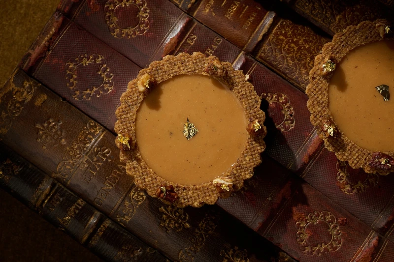 這款甜點是以 Chef Vincent 的童年味覺記憶為靈感,取胡桃和大溪地香草為主角,呈現溫暖又細緻的風味。底層使用60%胡桃帕林內,混合烘烤奶酥與胡桃碎粒,吃起來酥脆又帶著濃郁堅果香。中間是用大溪地香草慢慢煮成的英式奶餡,搭配減糖白巧克力香草慕斯,香氣清雅,口感輕盈滑順。最外層則是用胡桃泥做成的白巧克力鏡面,再加上鹽之花焦糖與杏仁奶酥點綴,甜中帶鹹、滑順不膩,將童年甜蜜而幸福的記憶以味道展現出來。