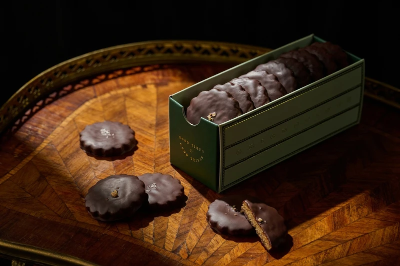 「巧克力夾心餅乾」是熱愛巧克力的 Valda 最為推薦的產品,這同時也展現她對風味和技術的極致追求。跳脫一般「餅乾包巧克力」的想像,讓餅乾本身成為整體口感和風味的重要一環。為了搭配濃郁的巧克力內餡,「VNV」特別開發了專屬的沙布雷餅體,不僅比一般沙布雷更穩固,也更酥脆紮實,吃起來層次分明。外層則包裹著一層70%的單一產區黑巧克力,帶有濃烈的可可香與剛好的苦甜平衡。整體尺寸比一般市售夾心餅乾大上兩倍,無論自己吃或跟朋友分享,都像是在享用一份小巧精緻的甜點。禮盒中共有四種口味,靈感來自四季的食材變化,包含:有機14號花生圓餅、有機香蕉圓餅、皮埃蒙特 IGP 榛果方餅,以及九鬼白芝麻方餅,每一款都吃得到食材風味與主廚的用心。