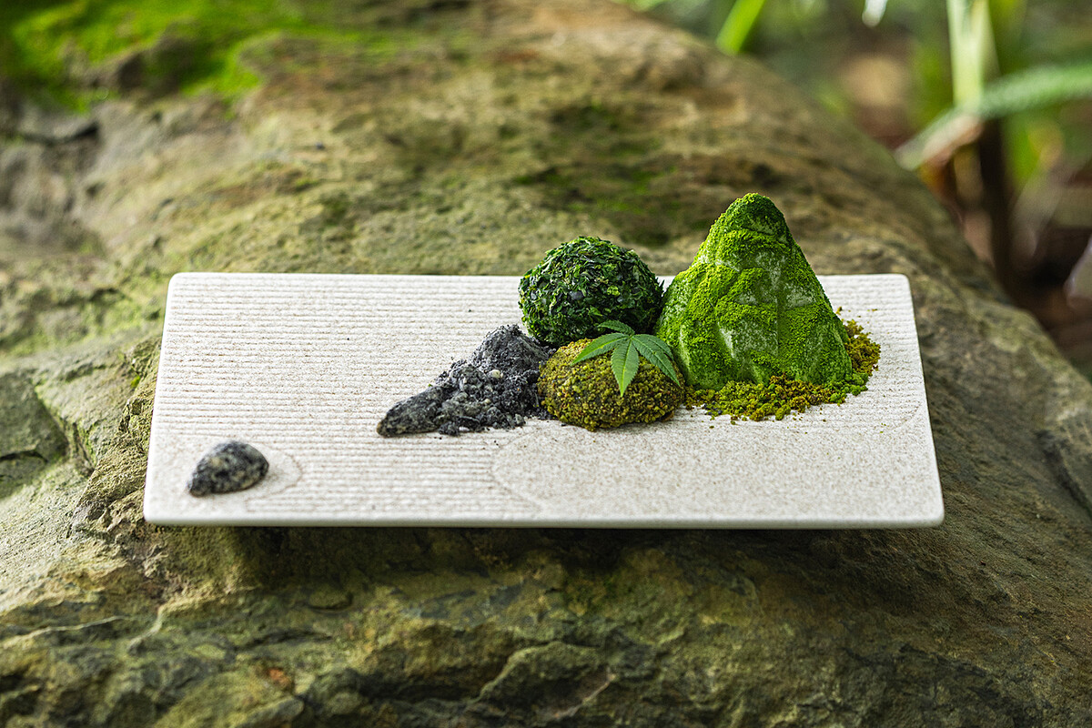 「箱庭 山本屋」最吸睛的當屬「枯山水盤」(380元/每日限量5份),這不是普通甜點,而是用甜點詮釋一座精神世界,白色紋路的盤子是白砂,抹茶慕斯和蛋糕是蓬萊山,紅豆紫蘇大福象徵蘚苔巨石,抹茶蕨餅則以碎餅與萬壽菊葉帶出細膩香氣,而那細長的舟石與杏仁芝麻餅乾島嶼,則勾勒出一段通往彼岸的詩意旅程。
