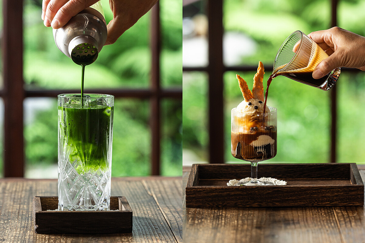 從昭和喫茶店汲取靈感的「森林水果布丁聖代」(380元),水果、布丁、鮮奶油、紅櫻桃完美排列,懷舊又浪漫。而「葉子布丁」(150元)則是視覺與自然連動的展現,抹茶布丁搭上鮮奶油與葉形蛋白餅,呼應庭院的自然綠意,小巧精緻,打開就像在掌心盛了一片春天。