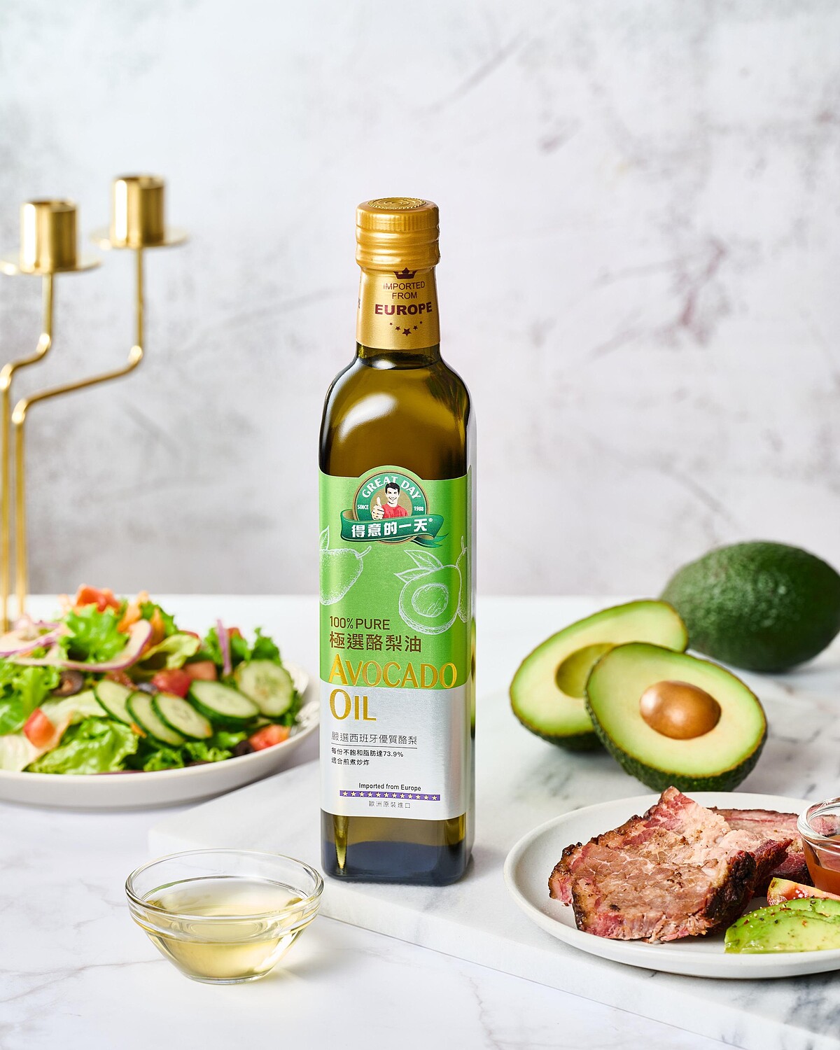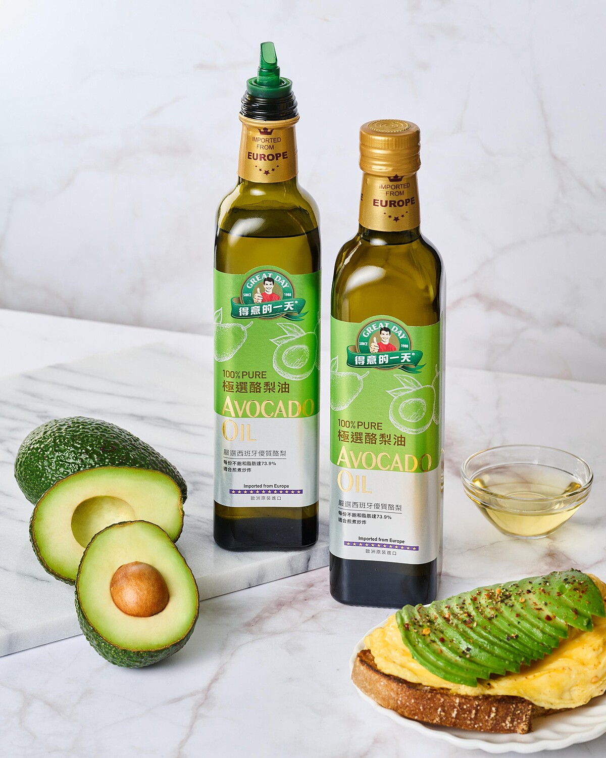 超模與明星們大量吃酪梨,藉由酪梨的天然脂肪酸與豐富營養,幫助維持自然光采與身心平衡。這樣的飲食風格我們當然能仿效,但新鮮酪梨並非一年四季都盛產,加上做酪梨料理,對多數人來說還是有點廚藝門檻…所以最簡單的方式就是:把「得意的一天極選酪梨油」帶回家!每天煎荷包蛋、燙青菜、煎魚、炒肉、拌沙拉…任何居家料理都能用上好酪梨油,天天均衡適量攝取好酪梨油,美味與健康兩者兼顧。