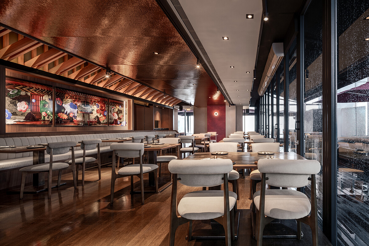 boon坐落在微風南山48樓,一進門就被胡桃木斜架構成的空間吸引,融合韓屋線條與現代建材語彙,丹紅色紋理牆面低調不搶戲。白天看起來像都市裡的療癒茶屋,入夜後燈光轉暗、大面落地窗反射整個信義區夜景,搭配茶鏡牆與Funktion-One音響,氣氛瞬間升溫,像進入東大門夜派對現場。
