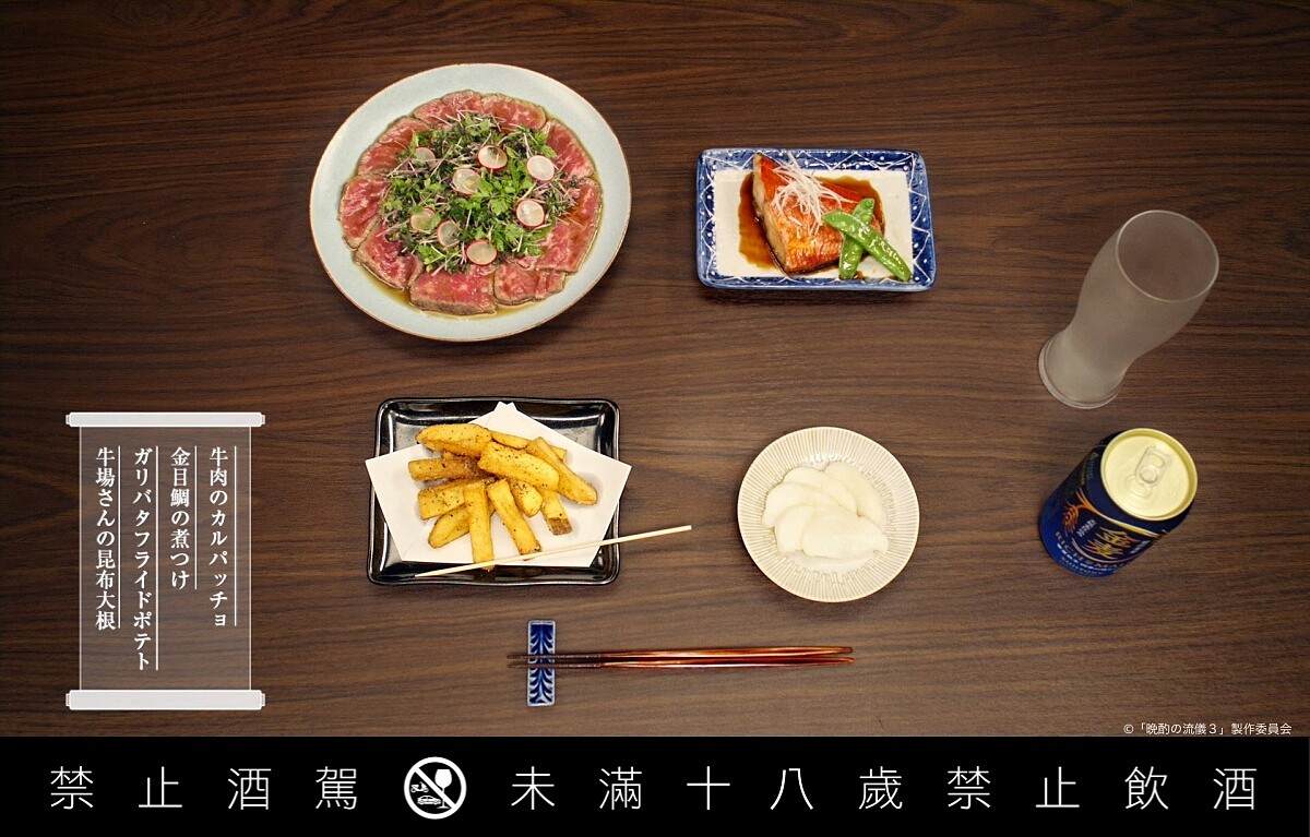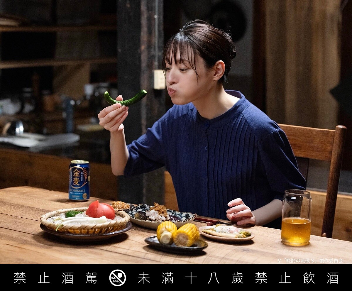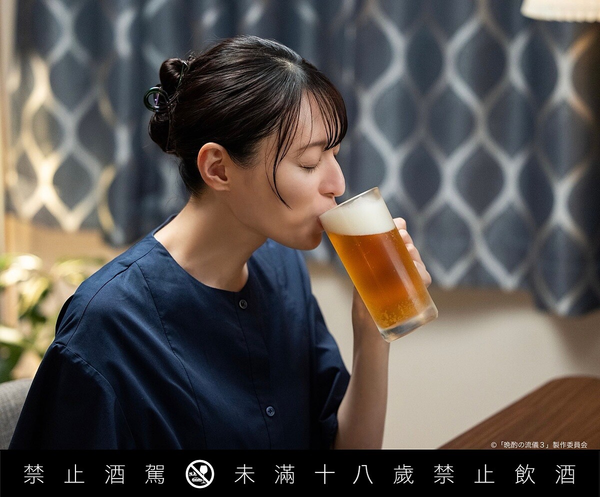 這部從2022年播出至今已推出第三季的《晚酌的流派》(日文:晩酌の流儀),可見在日本的高人氣,不只是美食日劇,更是一堂「獨酌哲學」實踐課。美幸的晚酌不是「隨便喝點什麼」,雖然美幸喝的都是suntory的金麥(最近廣告由帥大叔竹野內豐和昭和顏影后黑木華完美演出),而是有節奏、有準備地「用態度對待一杯酒」:早上出門前,絕對先把精挑細選的兩只酒杯冰鎮(有著各式各樣酒杯的酒杯櫃,也太讓愛喝酒的人羨慕)、六點準時下班回家、再去超市挑選當晚的下酒菜與搭配飲品。甚至懂得啤酒的完美倒法,控制角度與泡沫比例,讓喝下每一杯的瞬間看起來都像金麥廣告的 money shot,完全讓人醉人視覺,不馬上喝一杯不行啊。