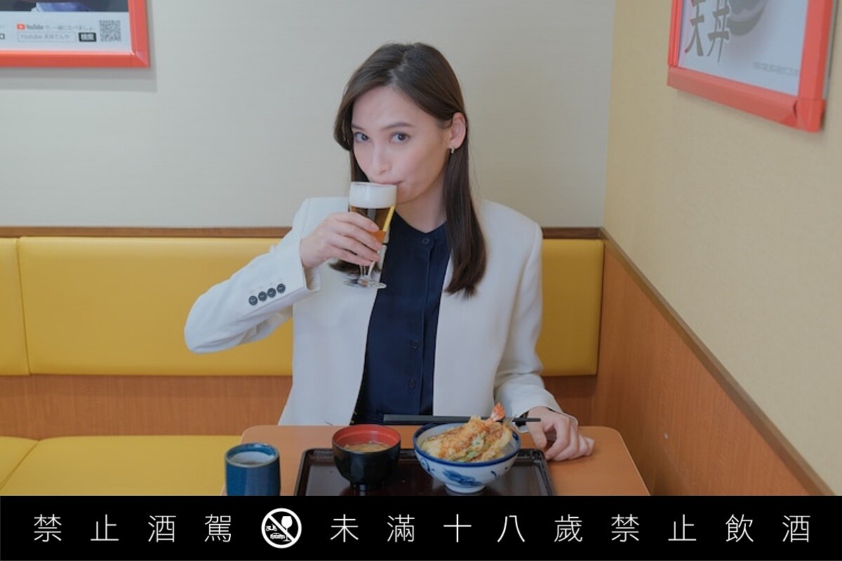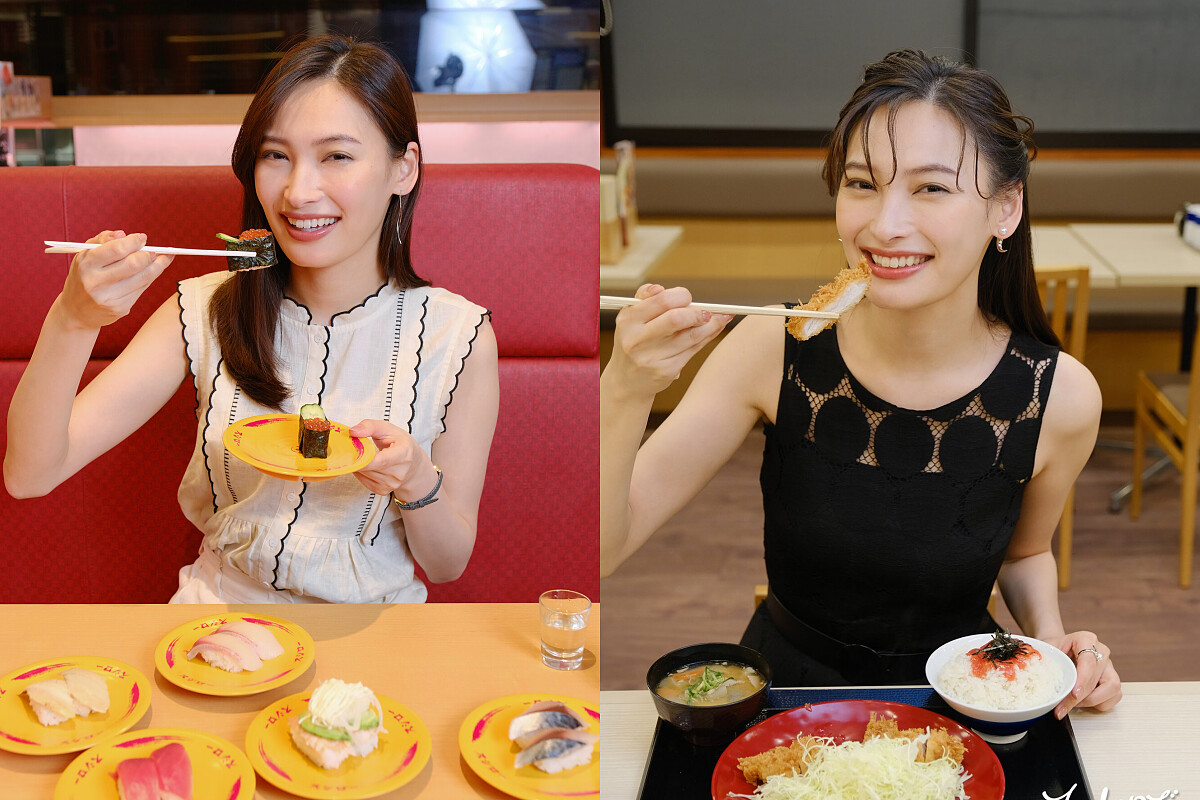什麼高級法式餐廳?NO!她奔向的是在台灣幾乎都可以吃到的王將的餃子、吉野家、吉豚屋 KATSUYA、volks 牛排、coco 壹番屋咖哩、壽司郎……而且不是草草解決,而是搭配各種酒類,搭配美食吃得浮誇又忘我,每次都彷彿進入《將太的壽司》的味覺異世界,上山下海漫畫式浮跨顏藝演出,甚至還會幻想自己縮小進食物裡頭!