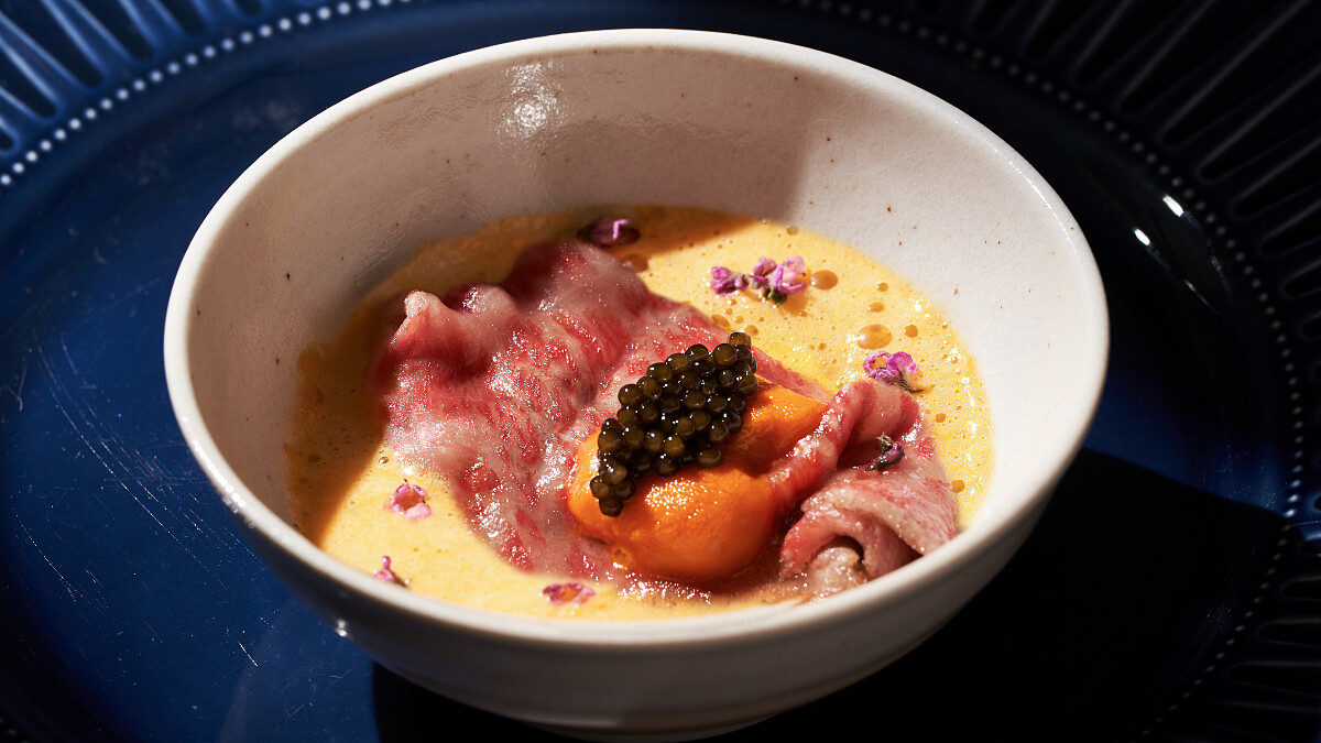 嚴選日本頂級A5 BMS 10-11和牛,佐以來自北海道的新鮮海膽、晶瑩剔透的鮭魚卵,與主廚特製濃郁月見醬交織出夢幻金黃,油花如霜降般細緻,每一口都是海陸精華的完美交響。