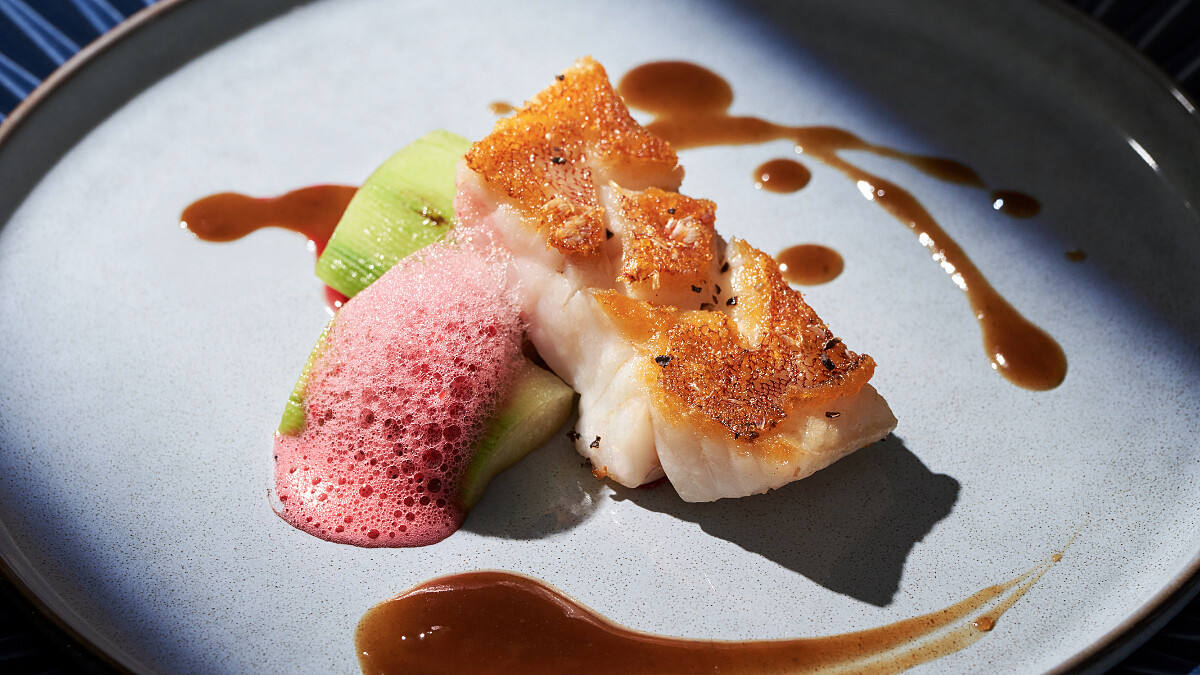 每日限定、產地直送的宜蘭蘇澳紅條魚,魚肉細緻中帶有彈性,搭配主廚巧思醬汁與時蔬襯托,完美演繹海味的純粹與優雅。