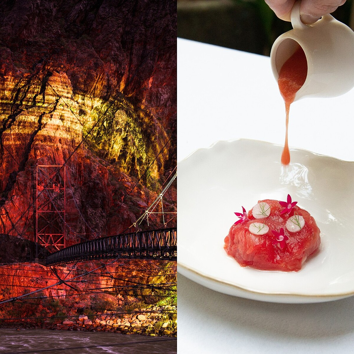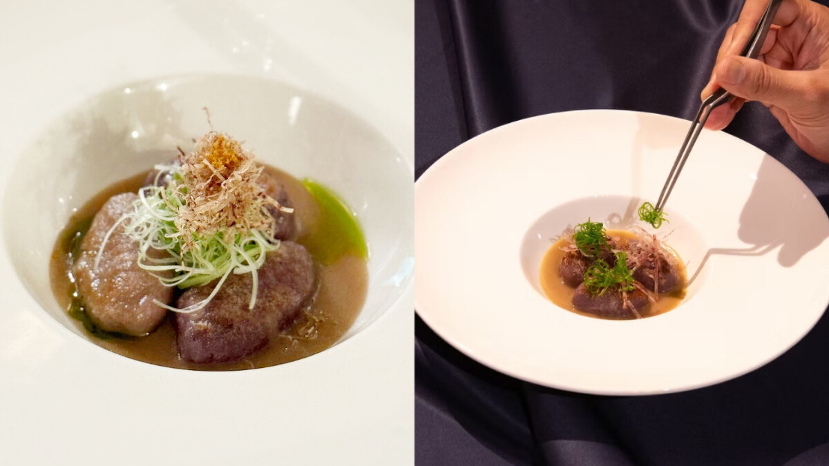 這道靈感來自人馬座A*黑洞,以醃漬西瓜的透明紅潤為基底,包覆鮮甜牡丹蝦,描繪星體爆發的視覺強度與夏日的味覺刺激,吃起來爽口開胃。