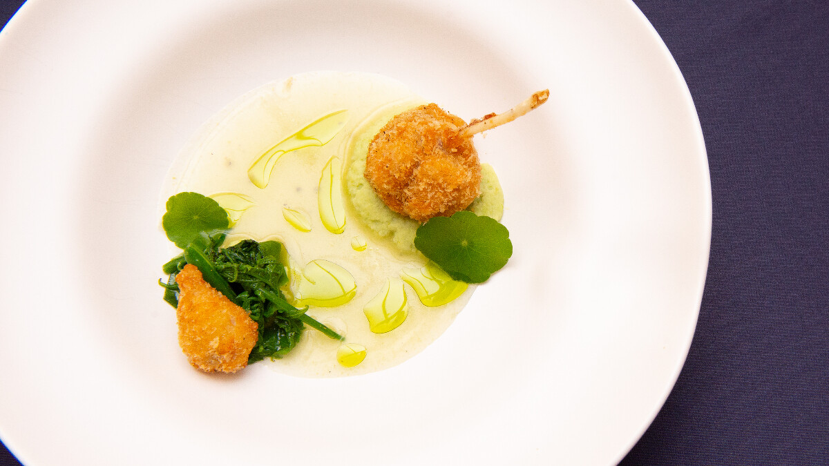 這道以田雞腿為主體的作品,搭配佛手瓜醬泥,將池畔風景為意象,呈現替代食材的可能性與未來糧食的思辨。