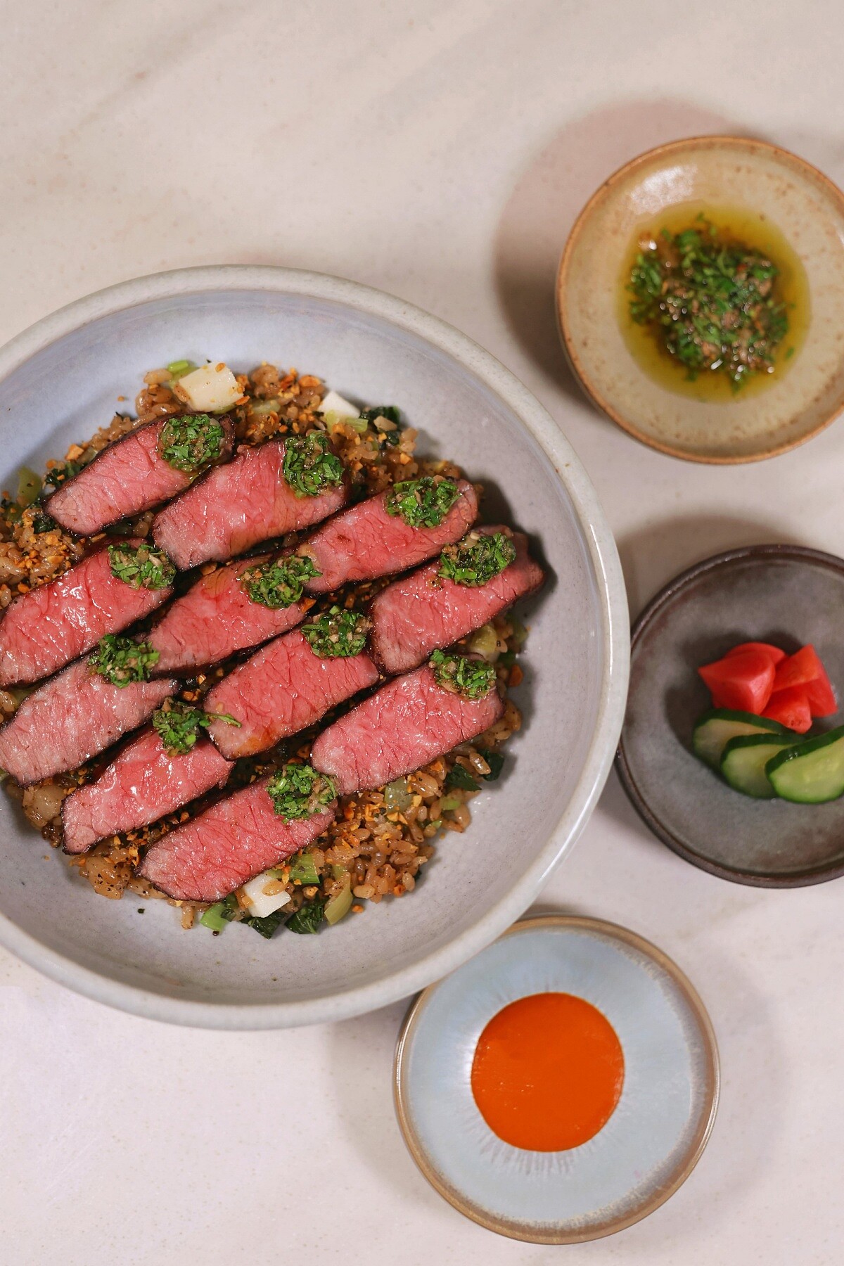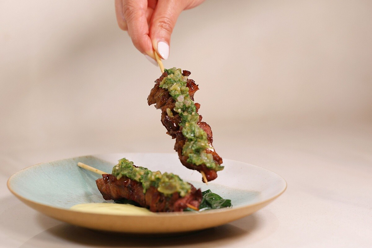Chef Kin將港式叉燒的銷魂鹹甜結合日式牛排丼飯澎湃大氣,是亞洲街頭的熟悉,亦是餐桌上的新解。美國Prime級牛小排塗抹自製黑蒜叉燒醬烤至晶亮油潤、鹹甜軟嫩;特選日本北海道七星米以雞高湯及鹽昆布炊煮,米粒鬆軟爽口粒粒分明,再以上海菜飯概念拌入青江菜,搭配香菜製成之阿根廷香草青醬(chimichurri),檸檬葉及香脆花生賦予靈魂美味,嗜辣者推薦適量搭配特製發酵辣椒醬,更顯鮮辣夠勁。NT,1980