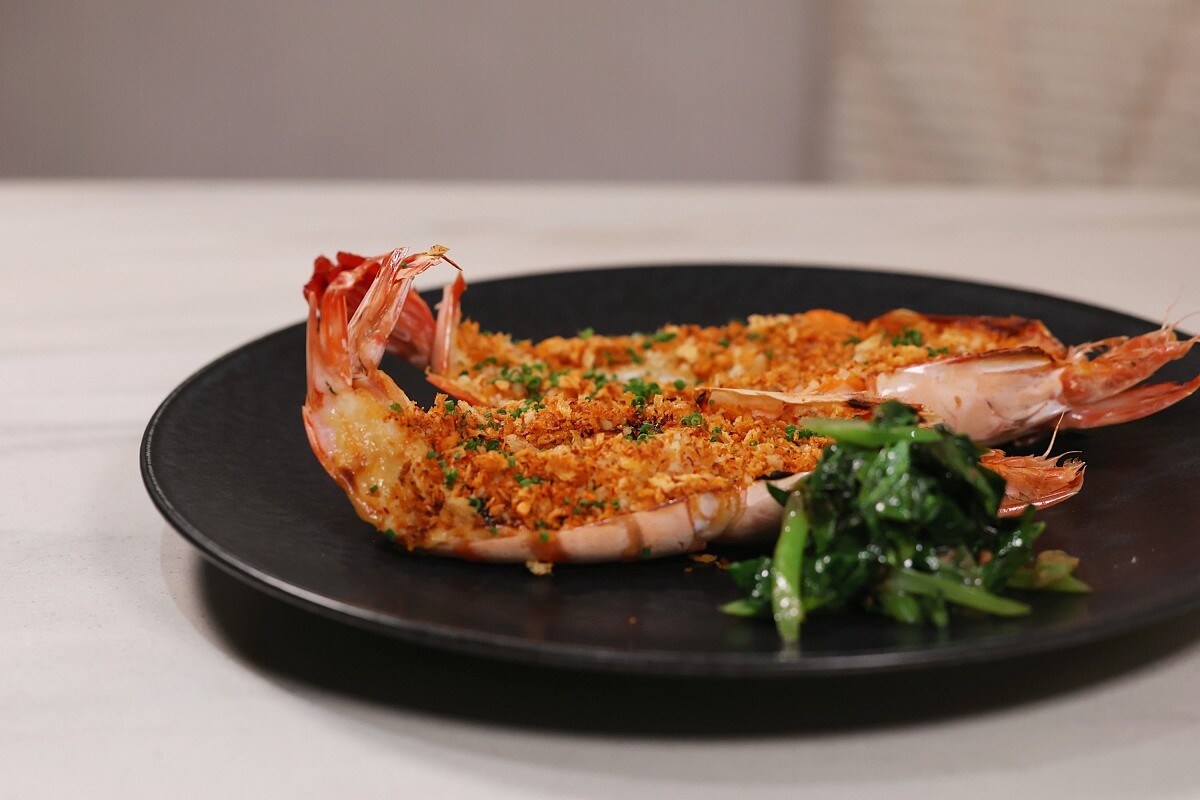 炙烤虎蝦、大蒜、芥藍、鹹蛋黃醬汁