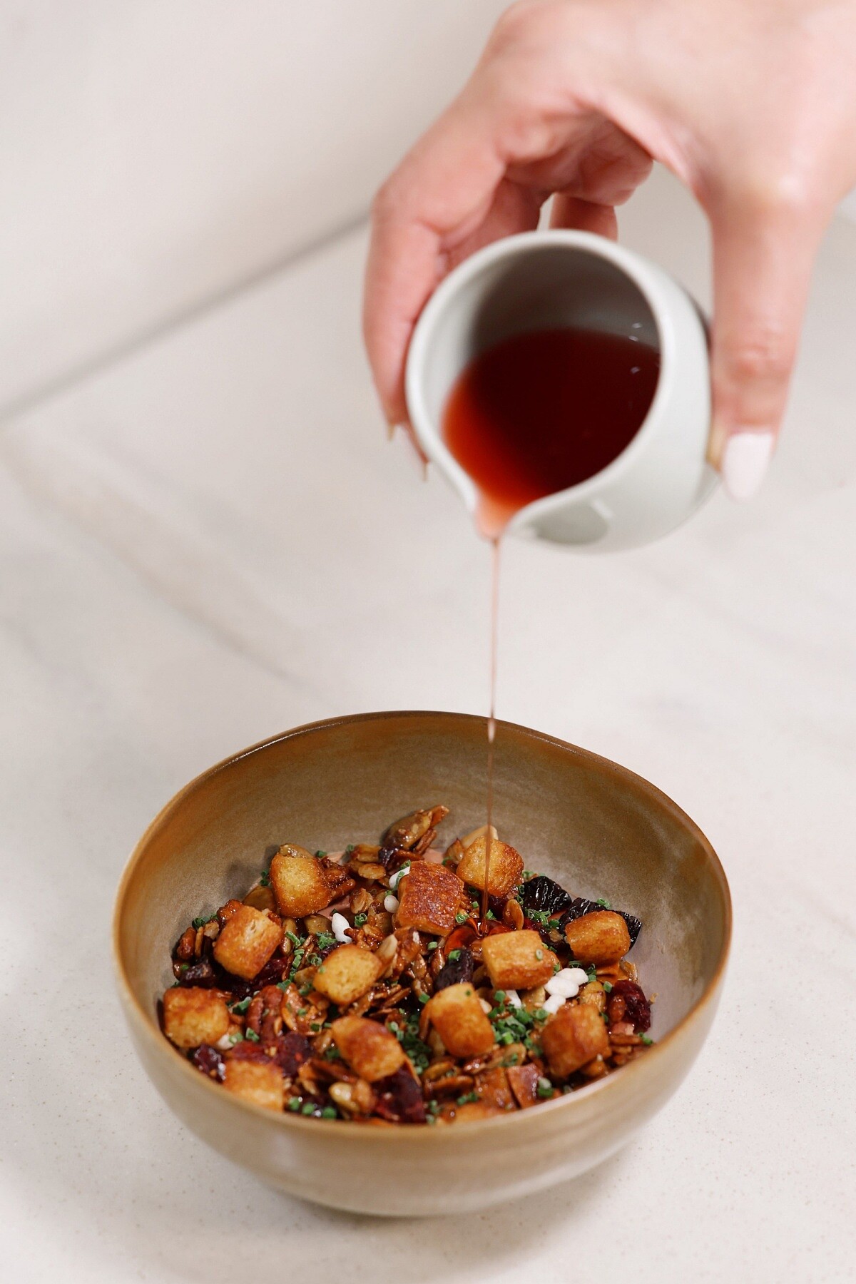 本地雞肝加入綜合香料及白波特酒、馬德拉酒製成細緻綿密,濃醇略帶甜韻的法式雞肝醬慕斯,以開胃麵包佐抹醬的概念,搭配烤至酥脆的布里歐麵包丁,自家烘烤穀物麥片及香甜草莓糖漿,吃了一口就忍不住嘴角上揚的開胃小品。NT380