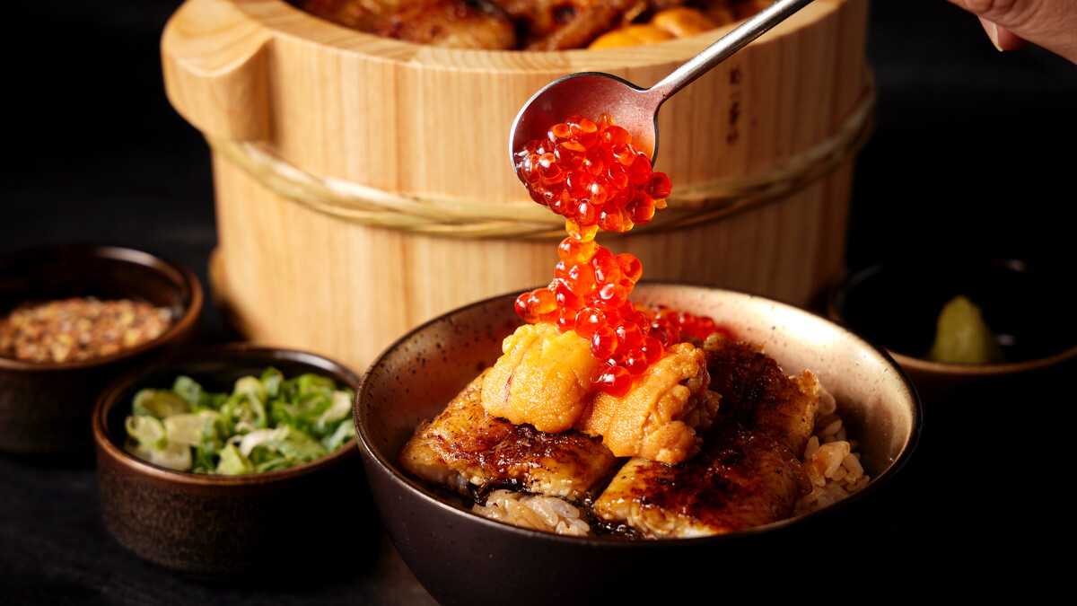 用台灣越光米搭配蒲燒鰻開場,再依序加入蔥花山葵、清茶湯,最後鋪上海膽與鮭魚卵點綴,一碗飯玩出五種風味,讓人一口接一口停不下來。