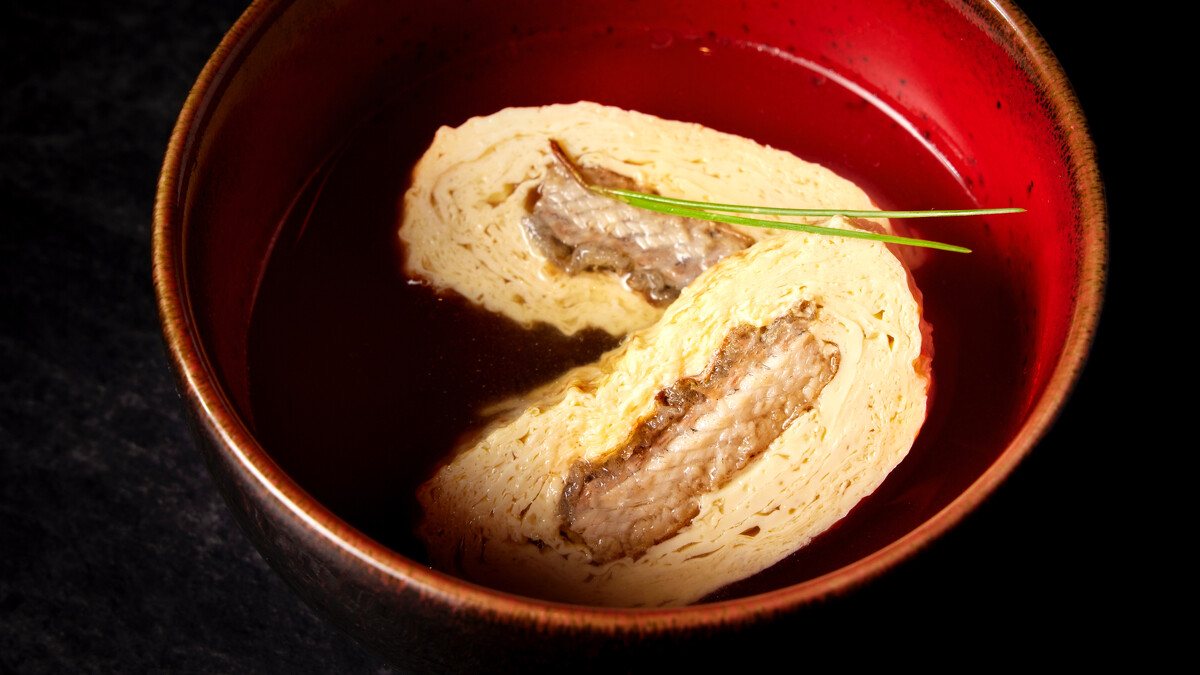 玉子燒包著蒲燒鰻魚,浸入柴魚昆布高湯中,綿密蛋香中透出魚香與湯味,細膩收尾,讓整餐在餘韻中落幕。