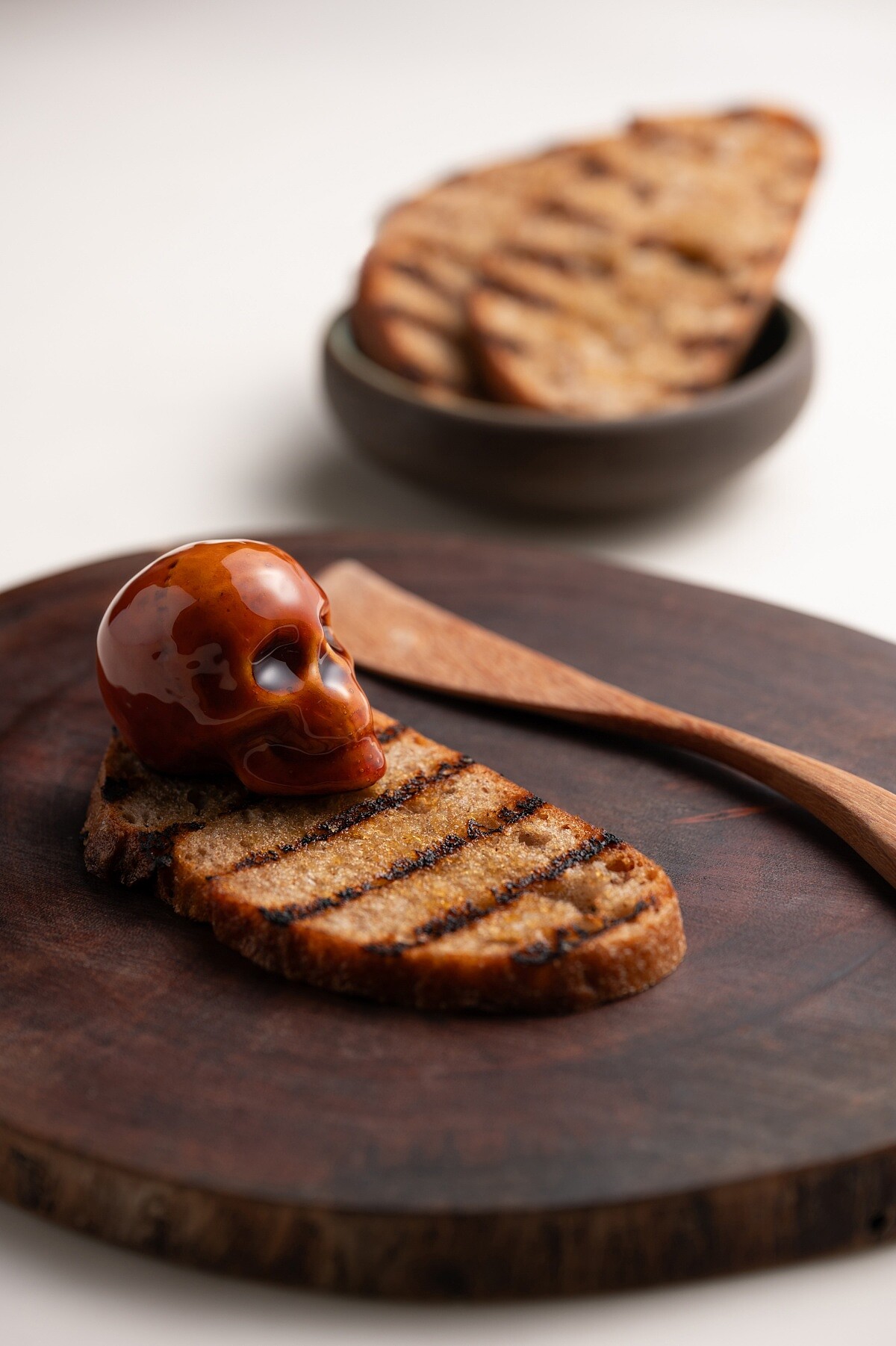 這道菜的靈感來自經典法式鵝肝醬,但 Dani Palm 選擇以台灣常見的粉肝取代,打破「奢華等於鵝肝」的既定印象。他將粉肝製成質地滑順、氣味溫潤的慕斯,造型上卻大膽地捏成骷髏頭模樣,搭配烘烤至外酥內軟的鄉村麵包。這不只是味覺上的創新,更像是主廚對高級料理的一次小小反叛,幽默地解構了「高級餐廳該有的樣子」。