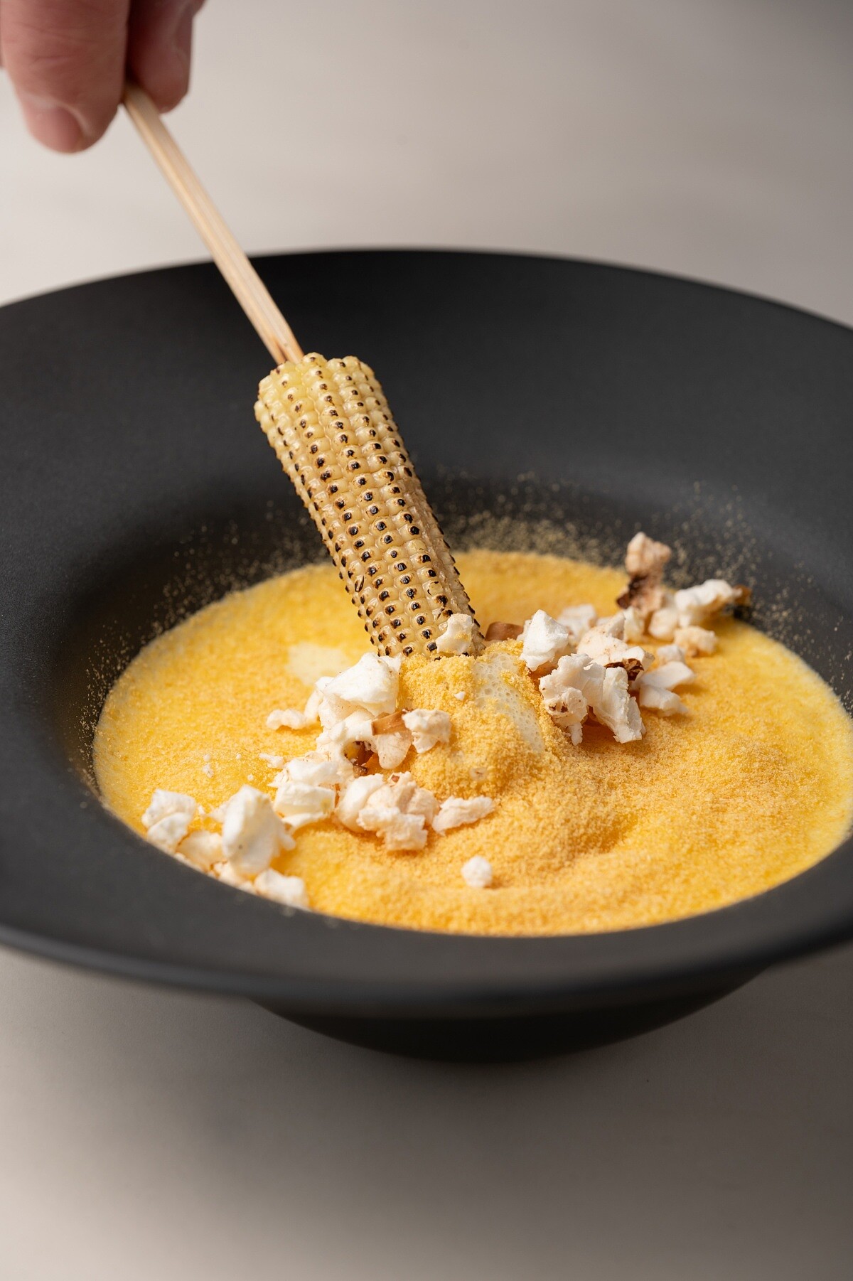 靈感來自街頭爆米花的香氣記憶,Dani Palm 刻意拋開濃稠的奶油基底,改以氮氣注入玉米湯體,創造出如泡沫般蓬鬆的口感。湯本身輕盈而帶甜香,入口即化,卻又富有玉米天然的黏稠回韻。搭配炙烤玉米筍,一口咬下是煙燻與穀物香氣交錯的層次感,喚醒人們記憶中那個午後攤販的畫面。