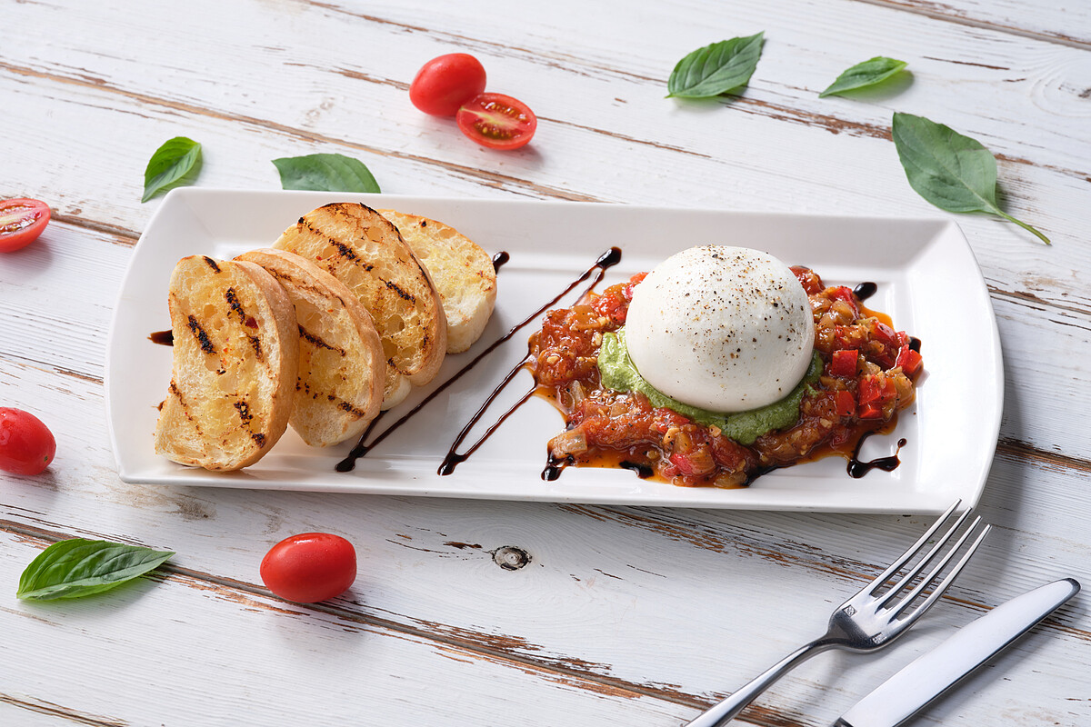 這波改版從開胃菜就讓人眼睛一亮,新推出的「烤番茄布拉塔」將香濃布拉塔起司與燉煮番茄、甜椒、洋蔥搭配,輕輕切開布拉塔起司牽絲的瞬間畫面感十足,再配上大蒜奶油麵包一起入口,酸甜中帶著滑順,令人食指大動,忍不住想再點一份。主餐部分同樣令人期待,「美式無骨炸雞」炸得酥香多汁,沾上蒜香帕米森起司醬,鹹香開胃;而「培根奶油雙色寬麵」則以粉紅醬為基底,滑順濃郁不膩口。